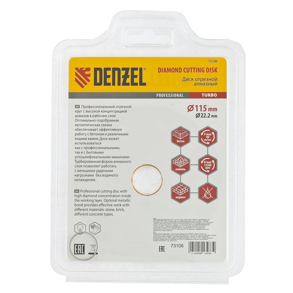 Универсальный алмазный диск ТМ Denzel предназначен для резки материалов: армированный бетон, бетон, кирпич, камень, шлакоблок, мрамор, тротуарная плитка. Тип диска 1A1R Turbo (Турбо). Режущая часть высотой 7 мм, выполена методом холодного прессования, с высокой концентрацией синтетических алмазов, повышает износостойкость диска и увеличивает скорость реза. Для использования на УШМ (болгарке) соответствующего типоразмера. Сухой рез, без использования водяного охлаждения. Рекомендован для бытового и профессионального использования.