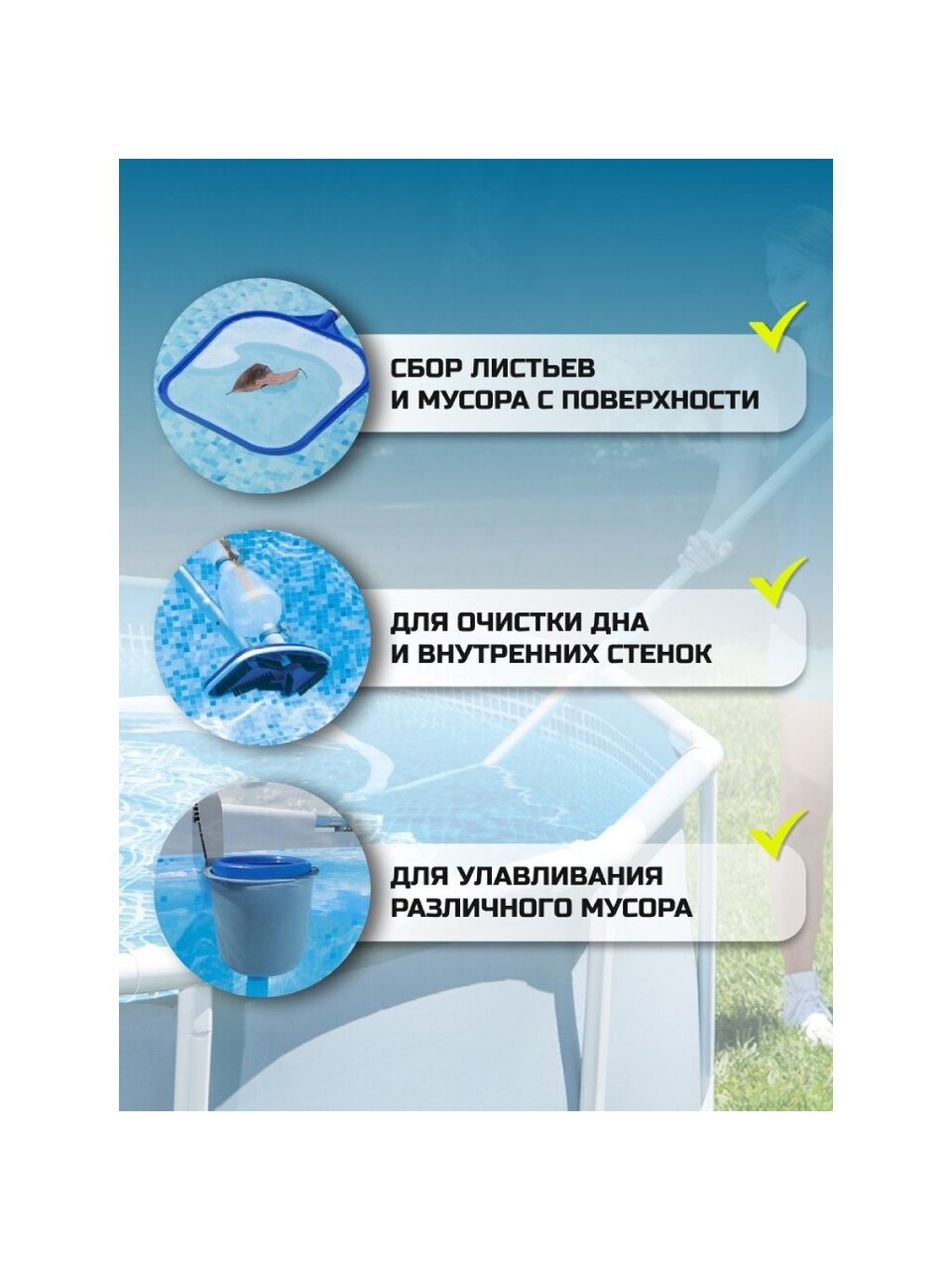 Покупка набора для чистки бассейна Bestway Deluxe – это не только удобство и простота ухода за бассейном, но и значительная экономия времени и сил. Больше не нужно беспокоиться о чистоте воды и безопасности купания. С этим набором бассейн всегда будет в идеальном состоянии, готовым к использованию в любое время. Сделайте правильный выбор для вашего комфорта и здоровья!