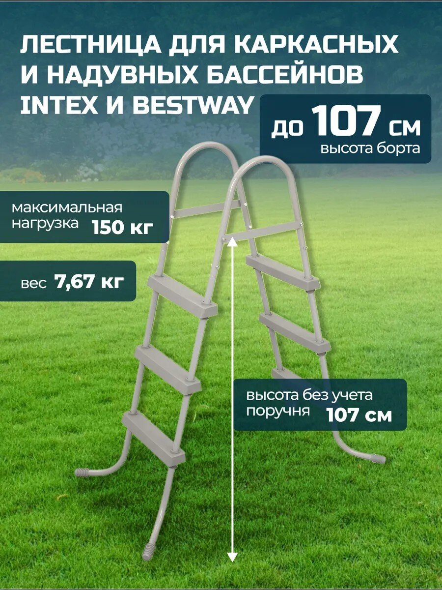 - Универсальность использования: подходит для каркасных и надувных бассейнов высотой 107 см.