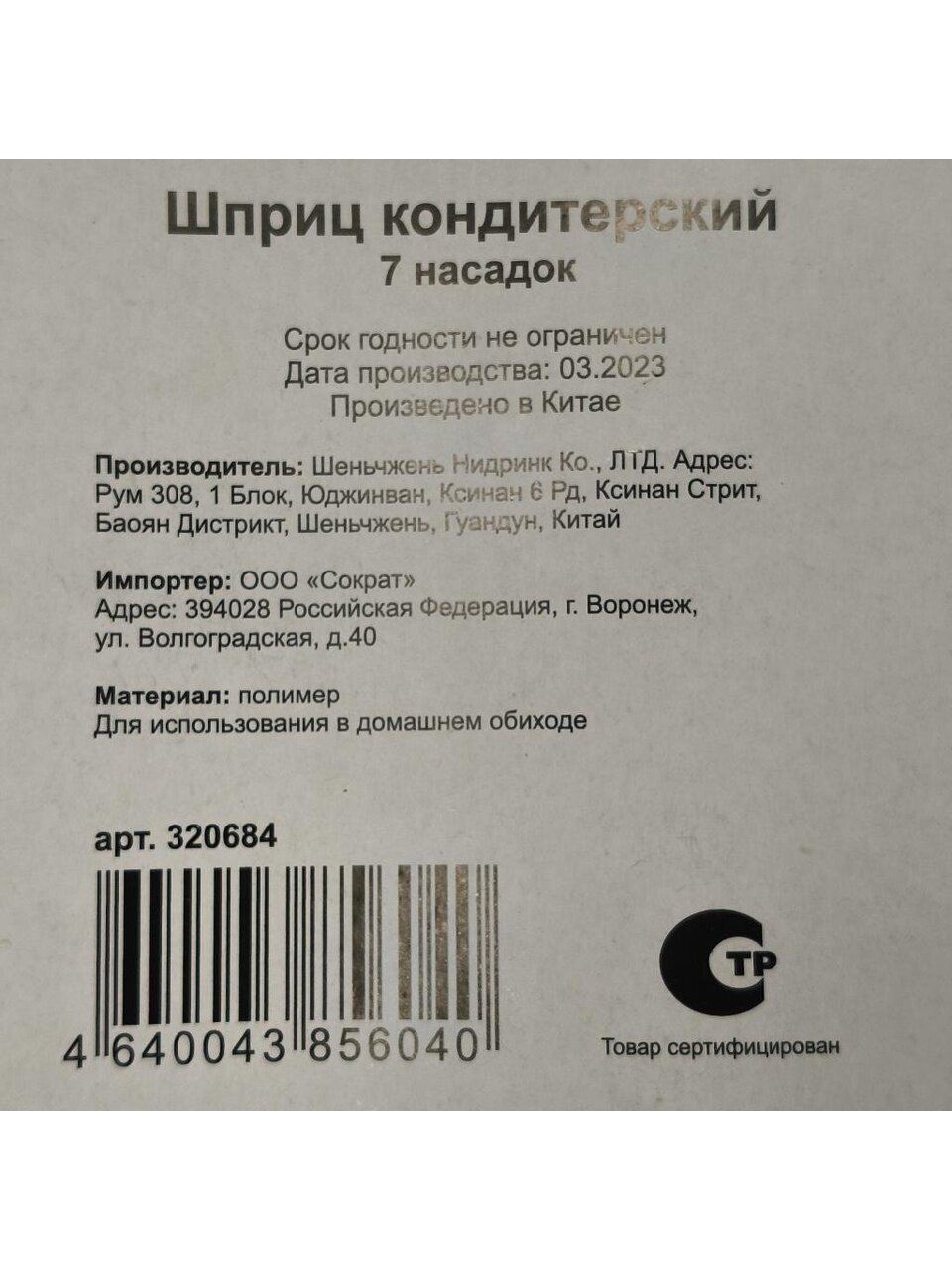 Вы можете приобрести «Шприц кондитерский + 7 насадок, навеска, в ассортименте, Y3-1239/320684» и другие товары в нашем интернет-магазине в Липецке по низким ценам и с бесплатным самовывозом.