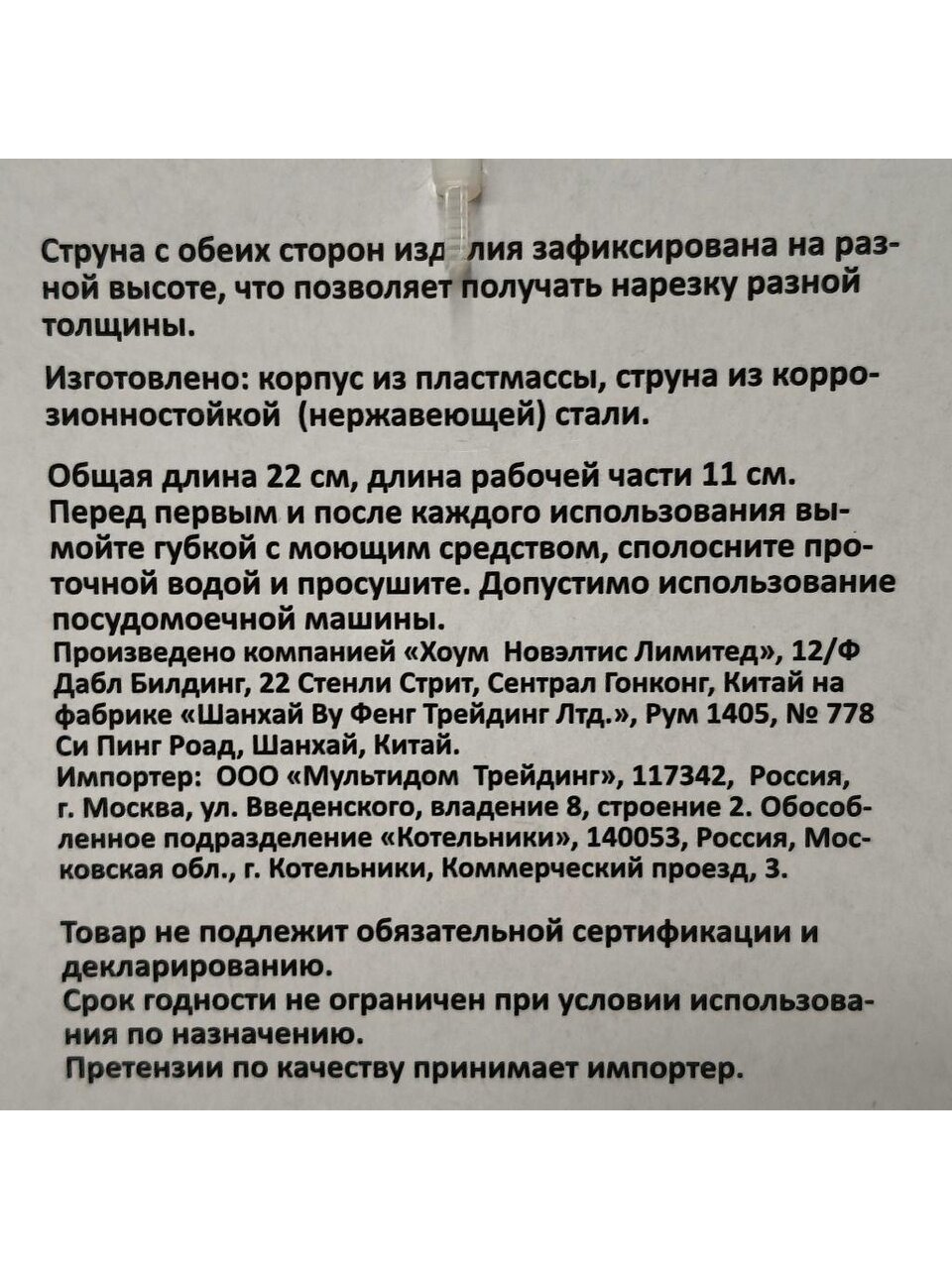Предназначена для нарезки сыра ломтиками одинаковой толщины. Струна с обеих сторон изделия зафиксирована на разной высоте, что позволяет получать нарезку разной толщины. Изготовлено: корпус из пластмассы, струна из коррозионностойкой (нержавеющей) стали. После использования промыть мягкой щеткой или губкой, можно с использованием жидких моющих средств.