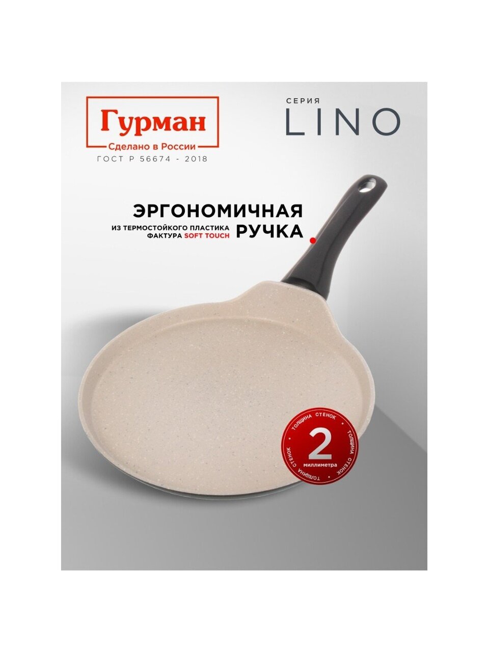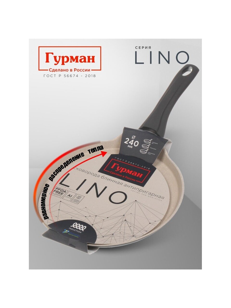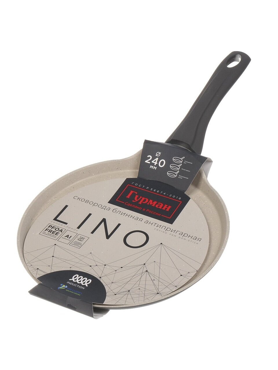 Вы можете приобрести «Блинница алюминий, 24 см, антипригарное покрытие, Гурман, Lino, ГМб241ЛИ, пластиковая ручка, индукция» и другие товары в нашем интернет-магазине в Обнинске по низким ценам и с бесплатным самовывозом.