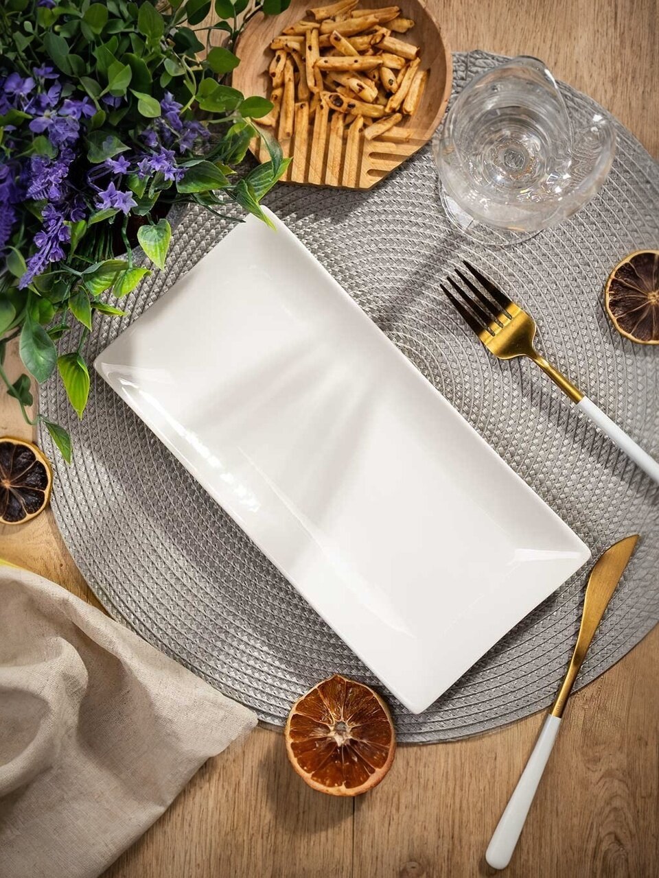 Длина — 25 см, форма — прямоугольная, цвет — белый, бортики предотвращают скатывание продуктов, материал — керамика, в наборе 1 штука, без крышки и подставки.