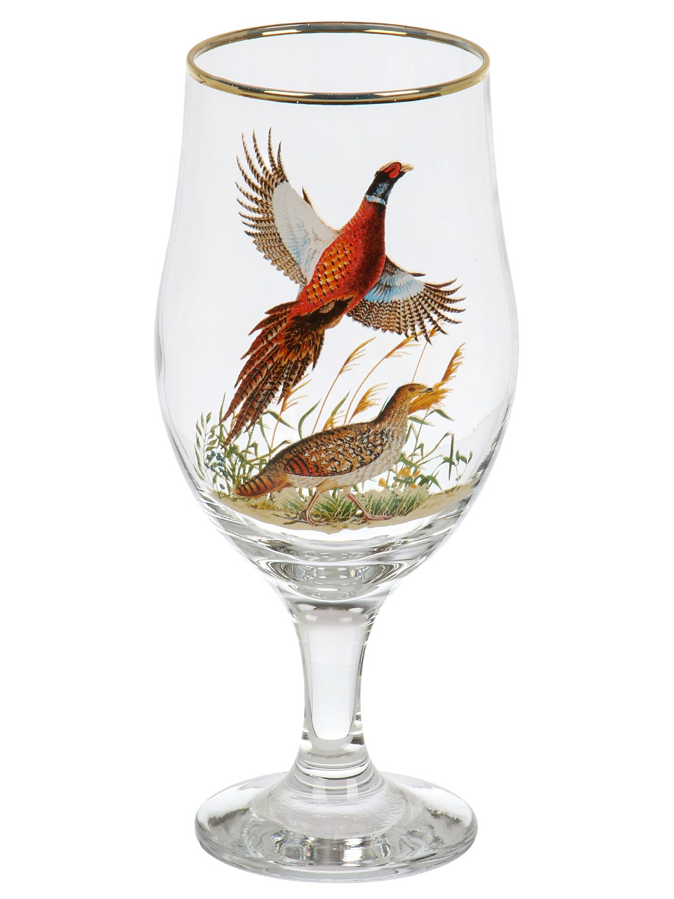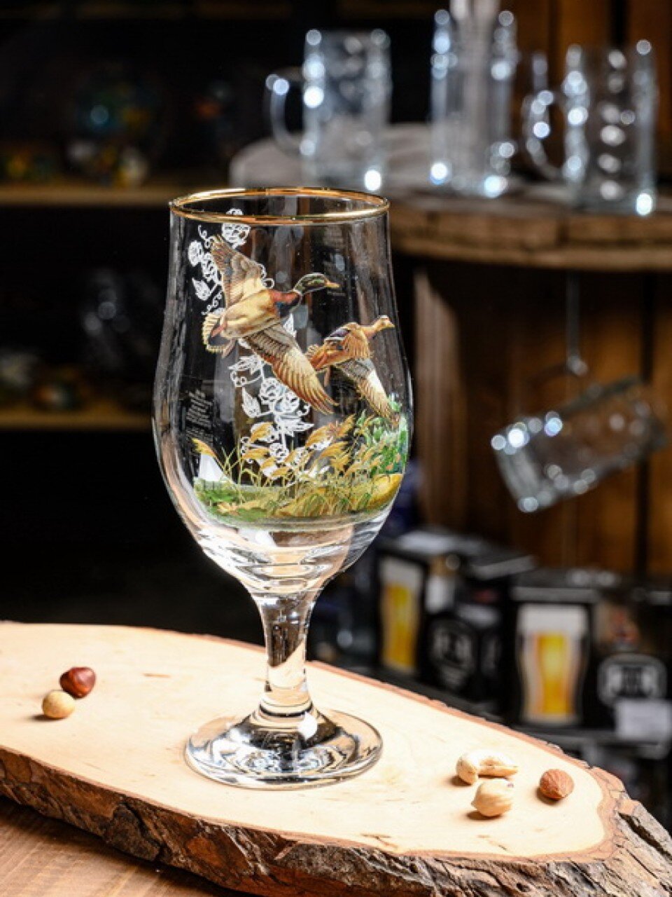 Бокал изготовлен из выдувного стекла, высота — 20.7 см, диаметр верха — 7.7 см. Гладкая текстура, декорированный рисунок, коллекция «Трофейная охота».
