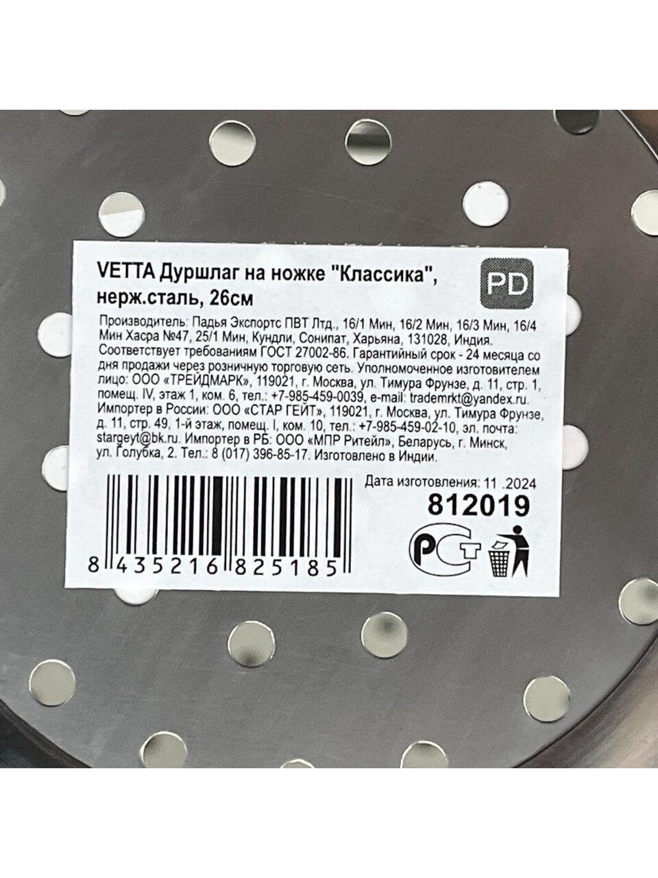 Вы можете приобрести «Дуршлаг нержавеющая сталь, 26 см, 3 л, на ножке, Vetta, Классика, 812-019» и другие товары в нашем интернет-магазине в Твери по низким ценам и с бесплатным самовывозом.