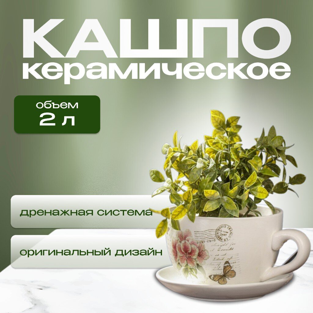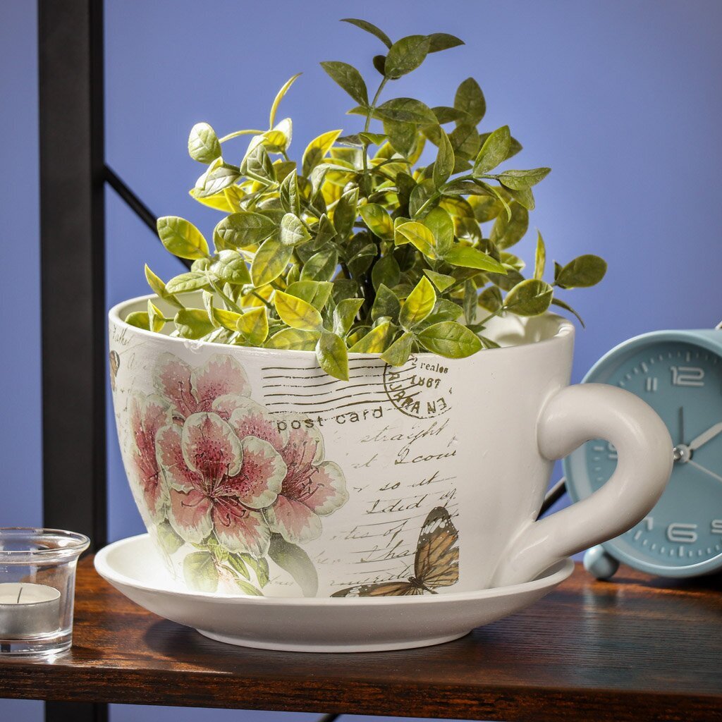Креативный горшок из керамики выполнен в виде чашки с блюдцем. Оригинальная форма и высокая функциональность рождают интересное сочетание, которое понравится поклонникам нестандартных решений и практичности одновременно. А вместительный поддон поможет не беспокоиться о вылившейся на подоконник грязной воде.