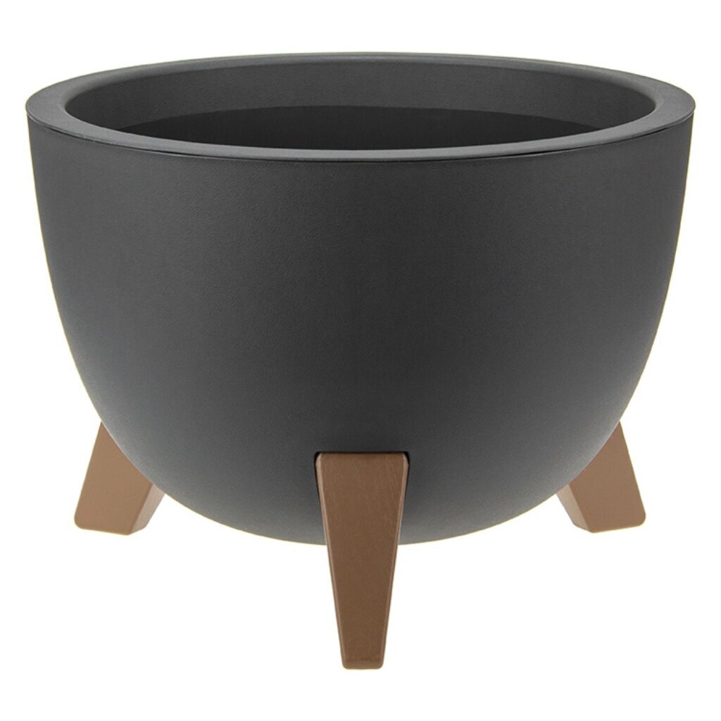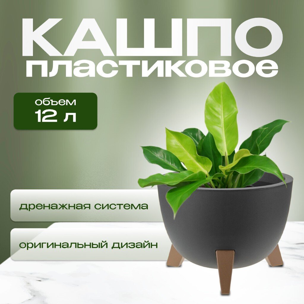 Кашпо со вставкой на ножках имеет круглую форму и матовую поверхность.