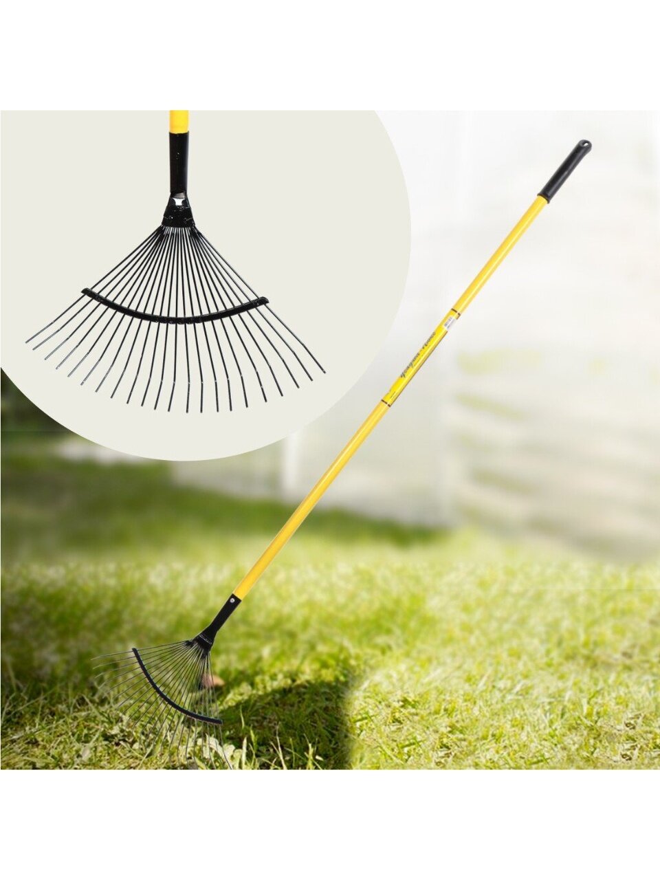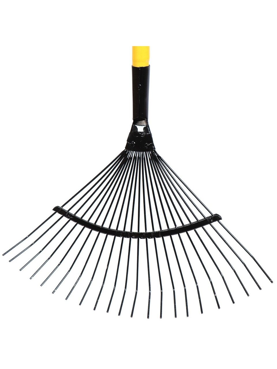 Грабли веерные металлические имеют 22 плоских зуба. Изделие окрашено, что обеспечивает надежную защиту от коррозии. Расположенная сверху распорка усиливает пружинящий эффект и дополнительно упрочняет конструкцию.