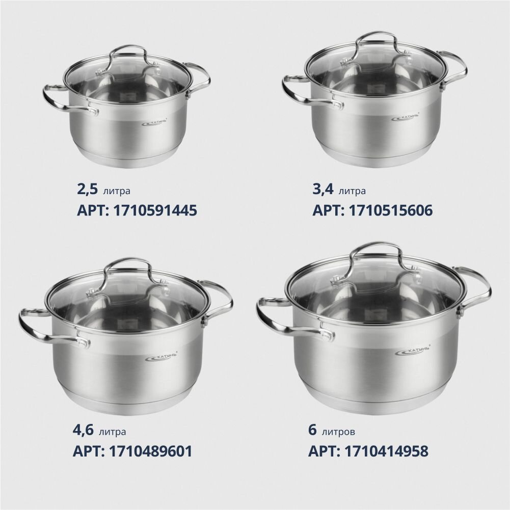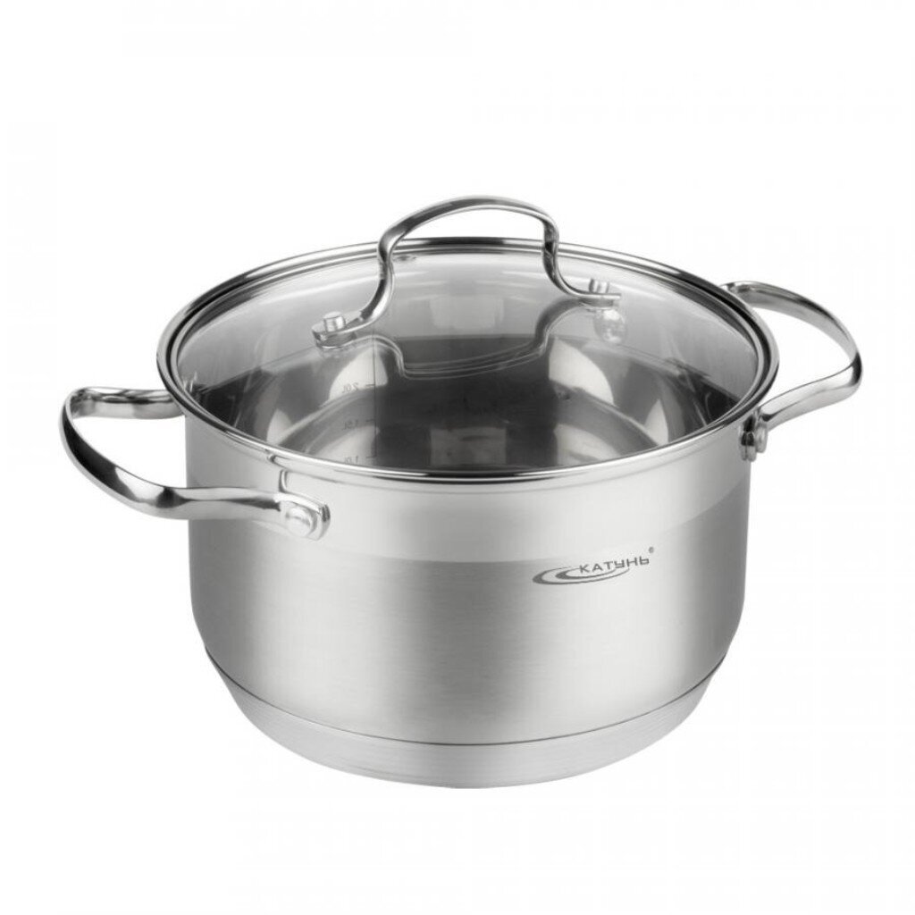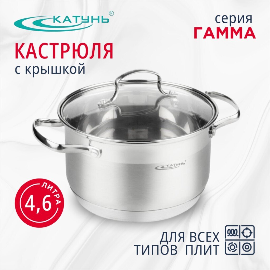 Кастрюля из нержавеющей стали 4.6 л Катунь Гамма: универсальное решение для индукции и любых плит. Стеклянная крышка, мерная шкала, выгодная цена — готовьте легко!