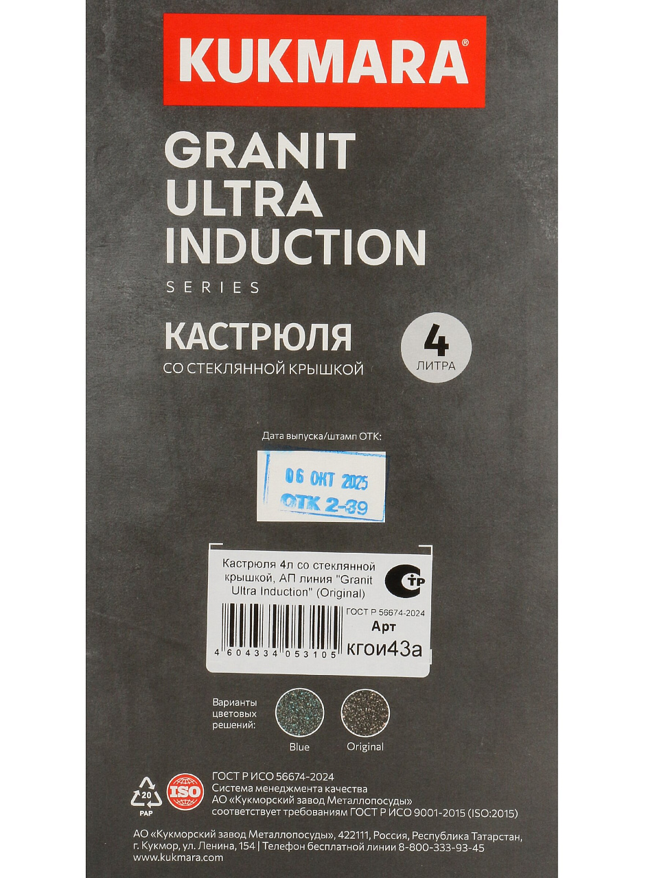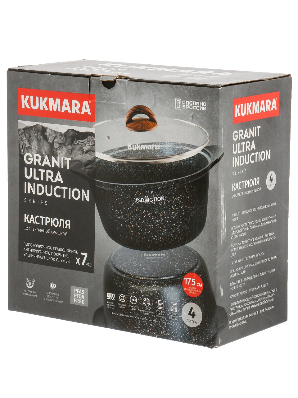 Кастрюля алюминиевая Kukmara Granit Ultra Induction 4 л с антипригарным покрытием и стеклянной крышкой: быстрое приготовление без пригорания, подходит для индукции.