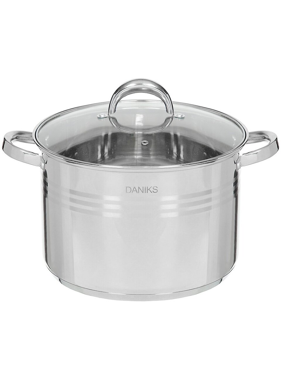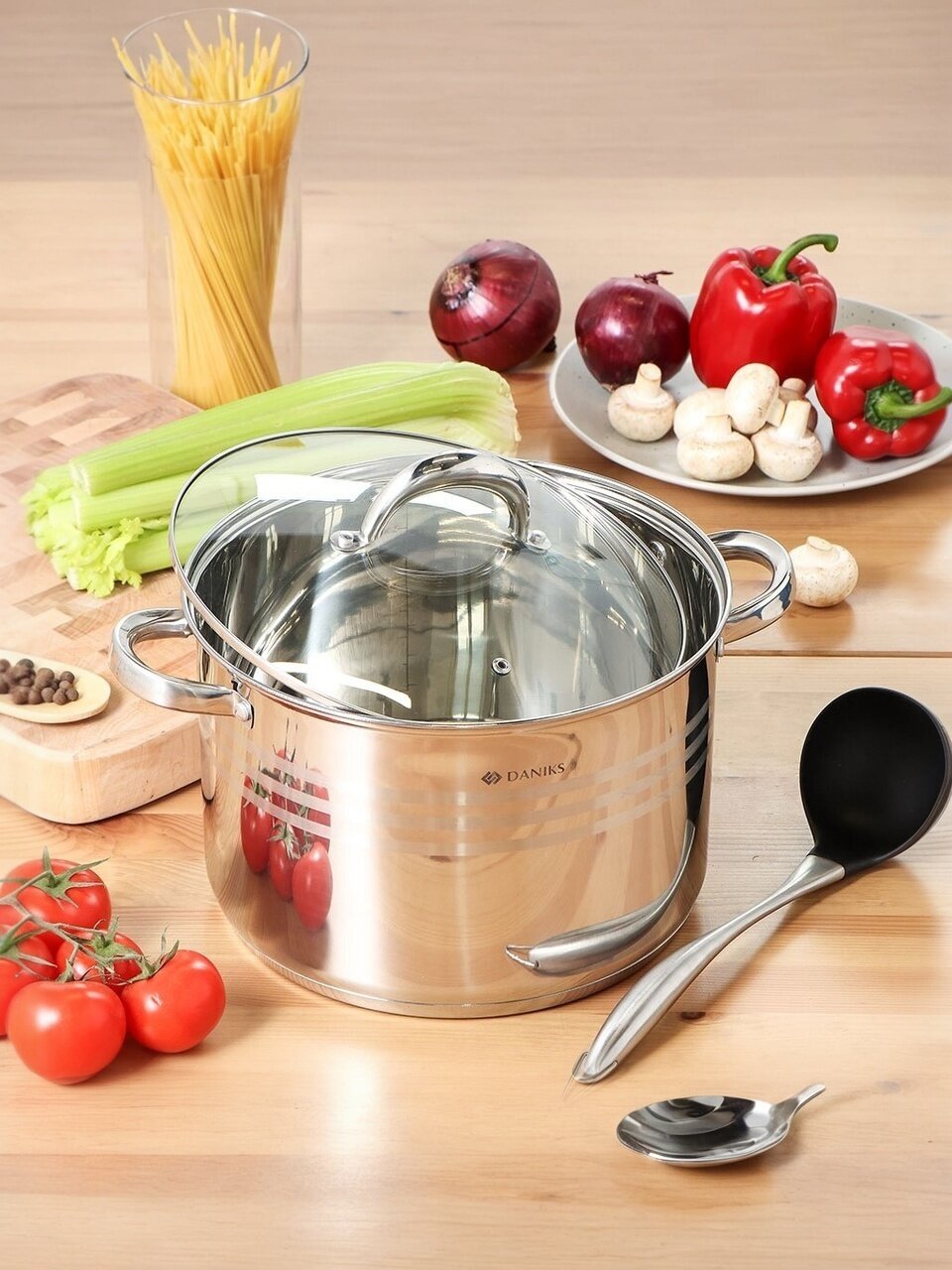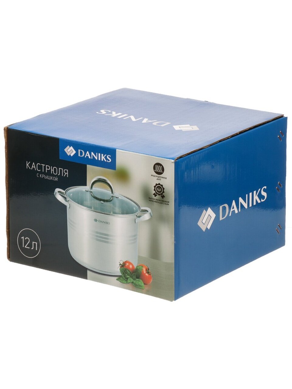Кастрюля из нержавеющей стали 12 л Daniks: для индукции, с мерной шкалой и стеклянной крышкой — оптимальное решение для кухни, дачи, общепита.
