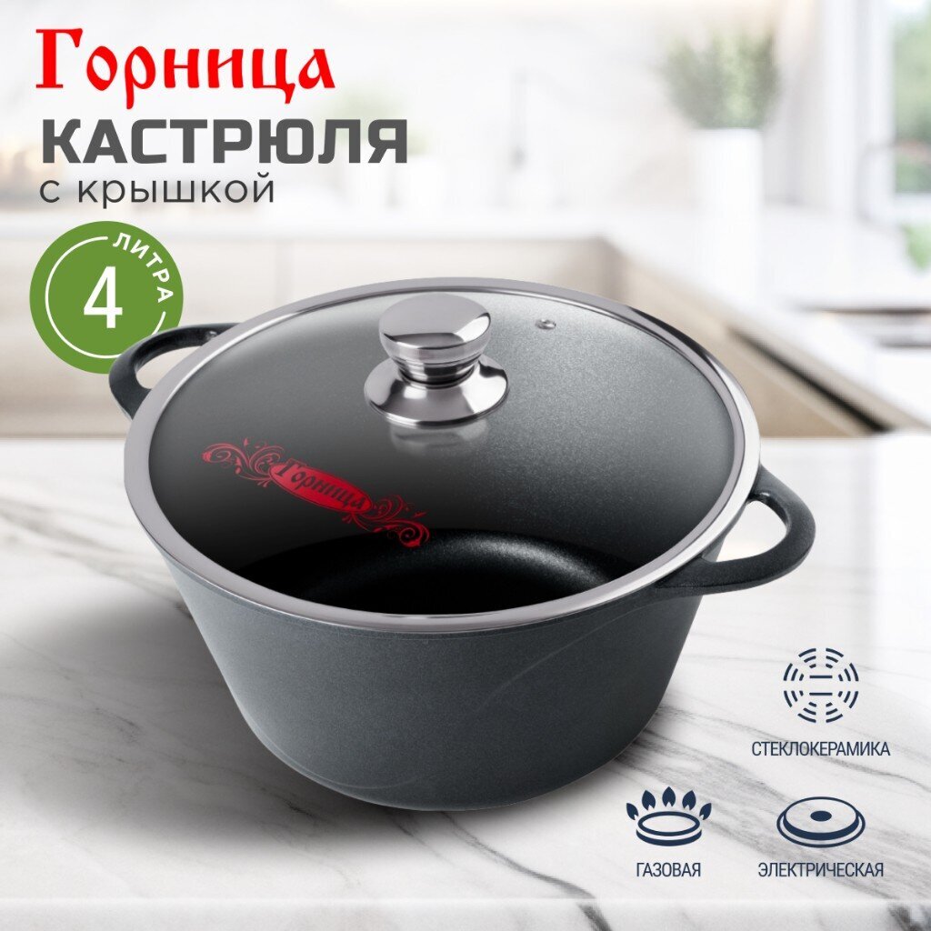 Кастрюля Горница Классик 4 л с антипригарным покрытием — идеальный выбор для семьи: готовьте супы, каши и плов без пригорания, легко мойте, используйте дома и на даче.