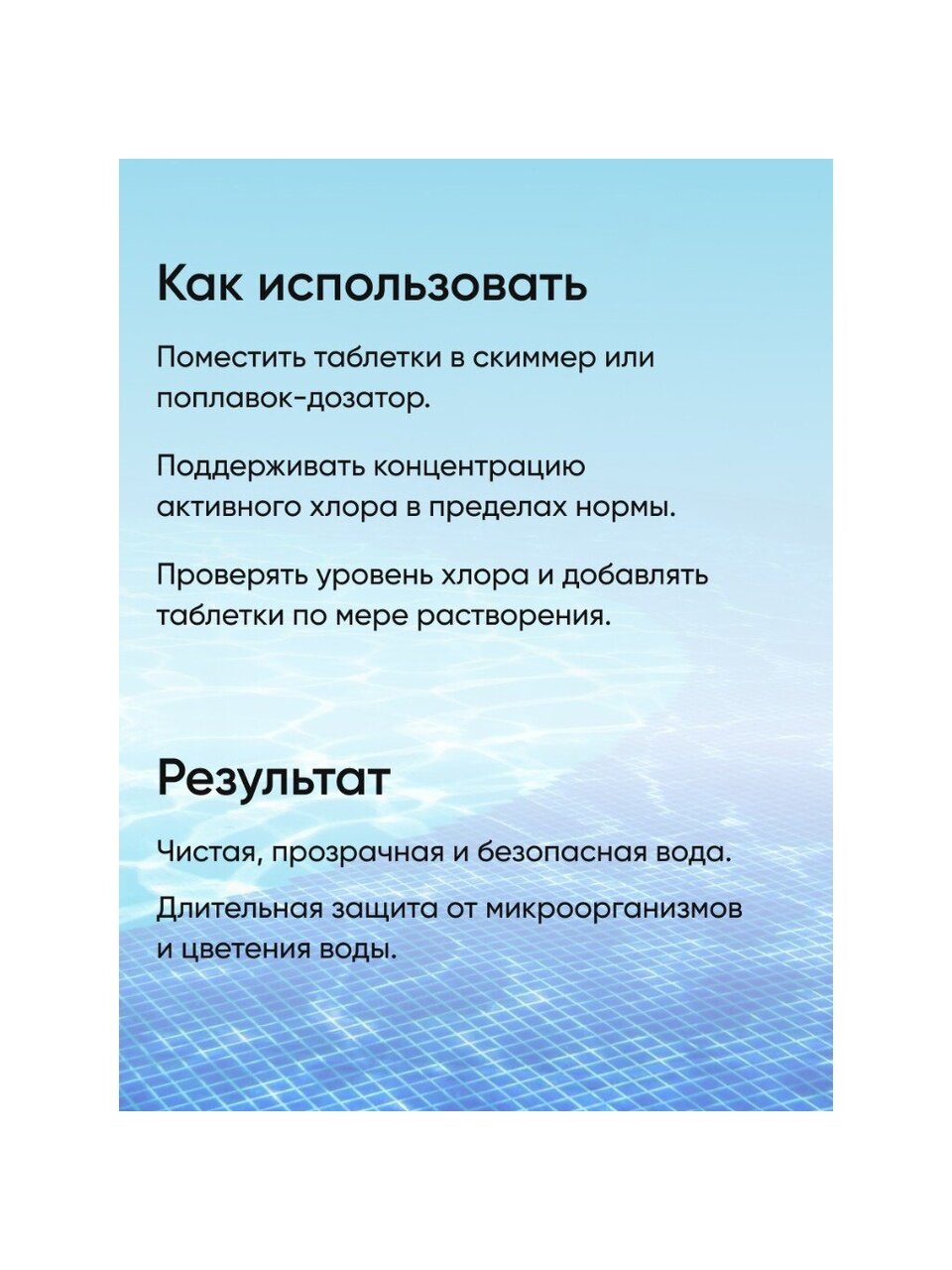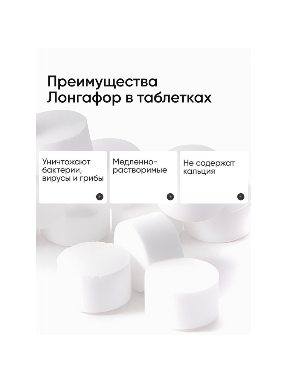 Средство Лонгафор – это химия для воды бассейна, которая не содержит кальция, что позволяет использовать его при любой жесткости воды. Таблетки способствуют осветлению воды, обеспечивая кристально чистый вид вашего бассейна. Активный хлор, являющийся действующим веществом, гарантирует максимальную защиту от вредных микроорганизмов, создавая безопасную среду для купания.
