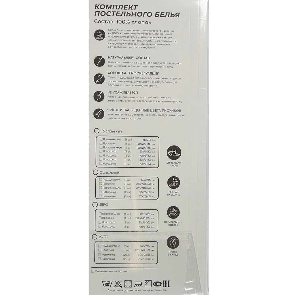 - Премиальный сатин люкс: гладкая ткань из 100% хлопка с эффектом шелка, устойчива к износу.