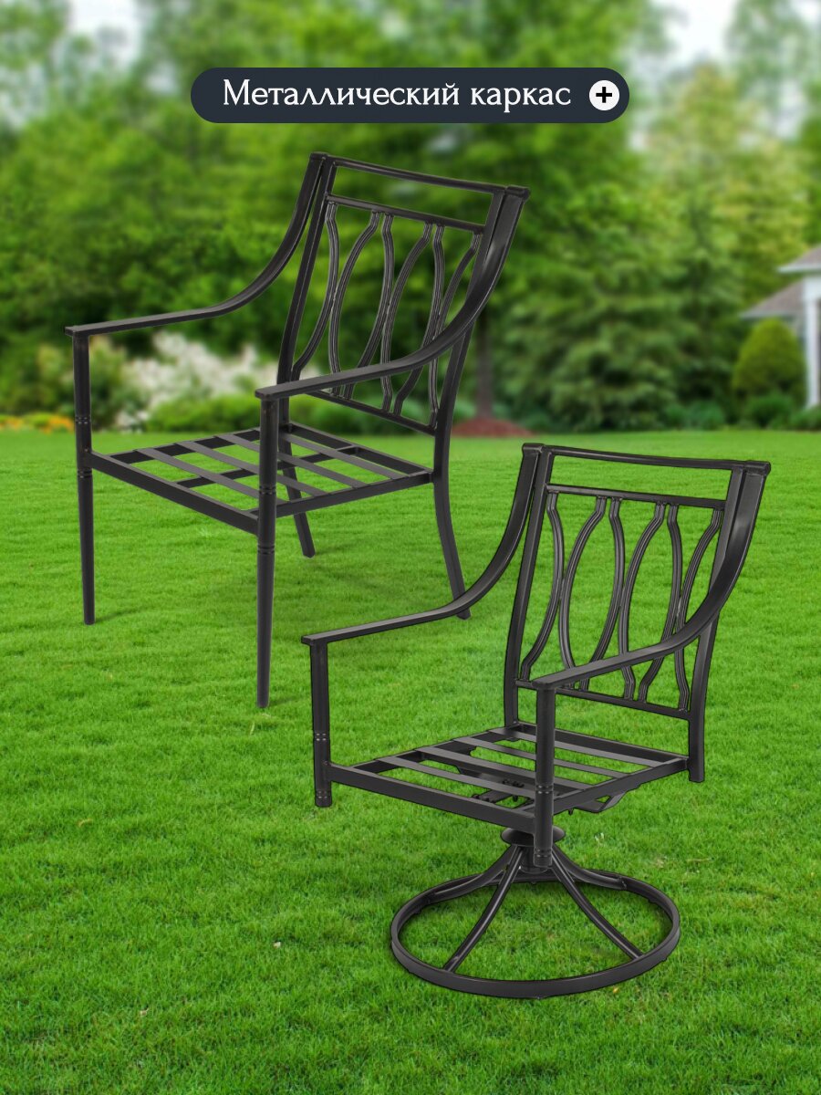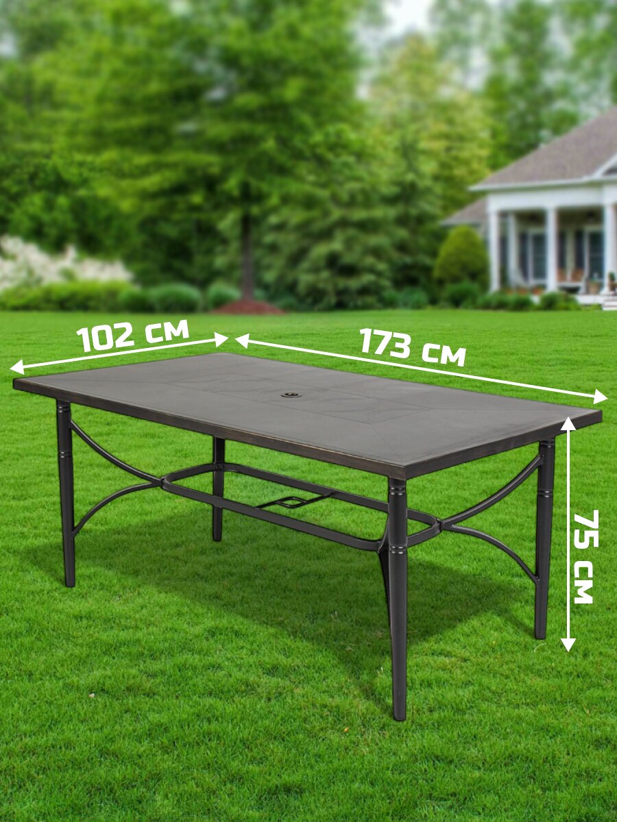 Мебель садовая Нойс – стильное и практичное решение для обустройства дачного участка, террасы, кухни, кафе или дома. Современный дизайн в универсальном черном цвете гармонично впишется в любой экстерьер, создавая атмосферу уюта и комфорта для отдыха и приема гостей. Комплект рассчитан на 6 персон и включает прямоугольный стол размером 173х102х75 см и 6 удобных стульев с подлокотниками и мягкими подушками размером 60х62х91 см. Прочная конструкция с каркасом обеспечивает надежность и долговечность эксплуатации, максимальная нагрузка как на стол, так и на стулья составляет 120 кг. Отверстие для зонта в центре столешницы позволит наслаждаться свежим воздухом даже в солнечную погоду.