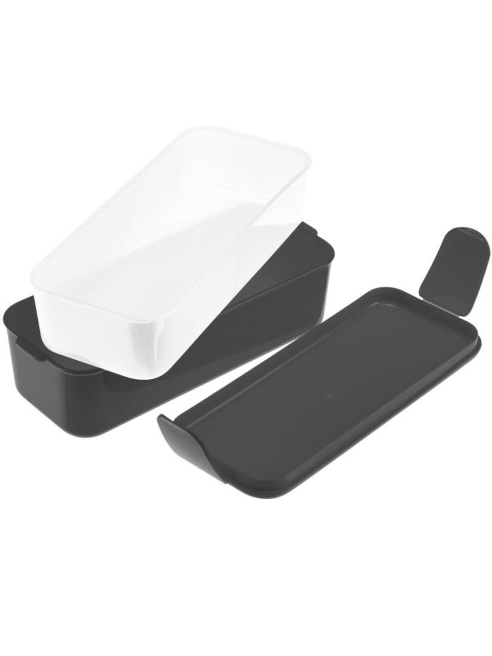 Общий объём — 1 литр (два отсека по 0.5 л), размеры: длина 20 см, ширина 8 см, высота 9 см. Контейнер выполнен из прочного пластика с герметичной крышкой на защёлке.