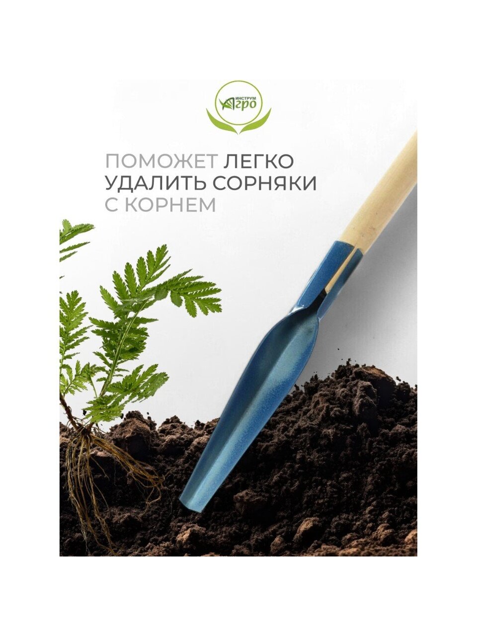 Металлическая часть из стали в порошковой окраске с деревянной ручкой высшего сорта для удаления сорняков в саду или на даче. Саморез обеспечивает надёжное крепление рабочей части к черенку. Длина 550 мм оптимальна для данного вида работ.