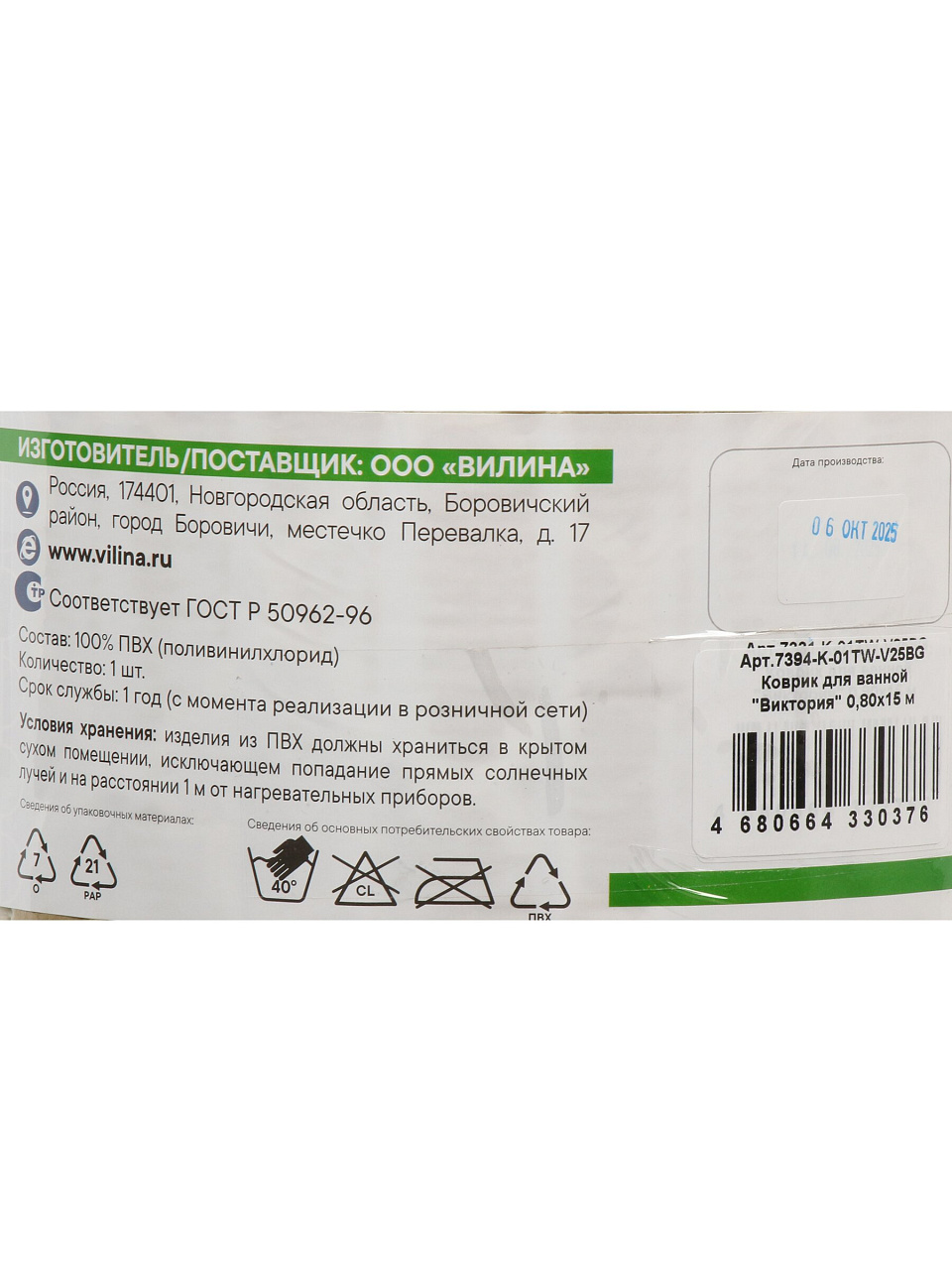 Коврик для ванной, антискользящий, 0.8х15 м, вспененный ПВХ, Вилина, Виктория, V25BG