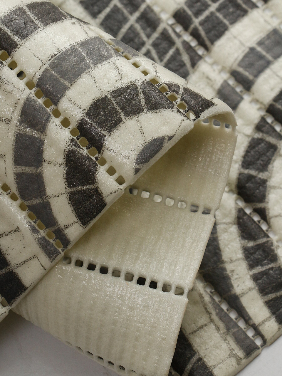 Материал — вспененный ПВХ, коврик не оснащён присосками, но его рельефная поверхность предотвращает скольжение.