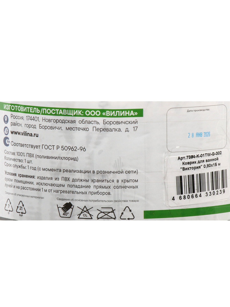 Коврик для ванной, антискользящий, 0.8х15 м, вспененный ПВХ, Вилина, Виктория, 302G