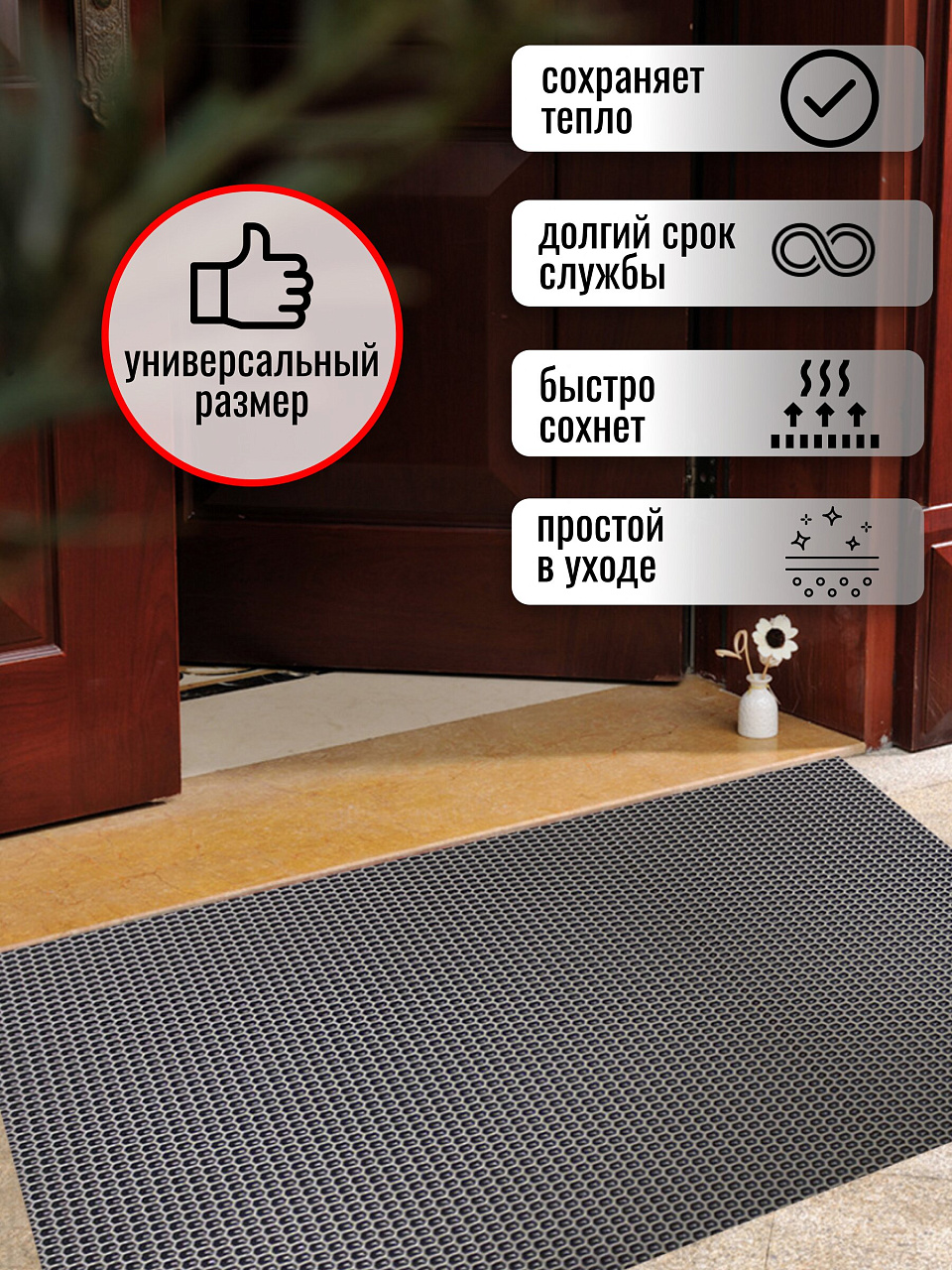 Универсальный коврик из материала EVA станет отличным помощником в поддержании чистоты в доме и стильным дополнением к интерьеру. Если разместить его у входа, то вся грязь, пыль и влага с обуви останутся внутри ячеек коврика и не попадут в дом. Такой коврик также пригодится для колясок и велосипедов: вся грязь с колёс останется на нём. Ещё одно применение EVA-коврика — в ванной комнате: специальные ячейки задержат пролитую жидкость.