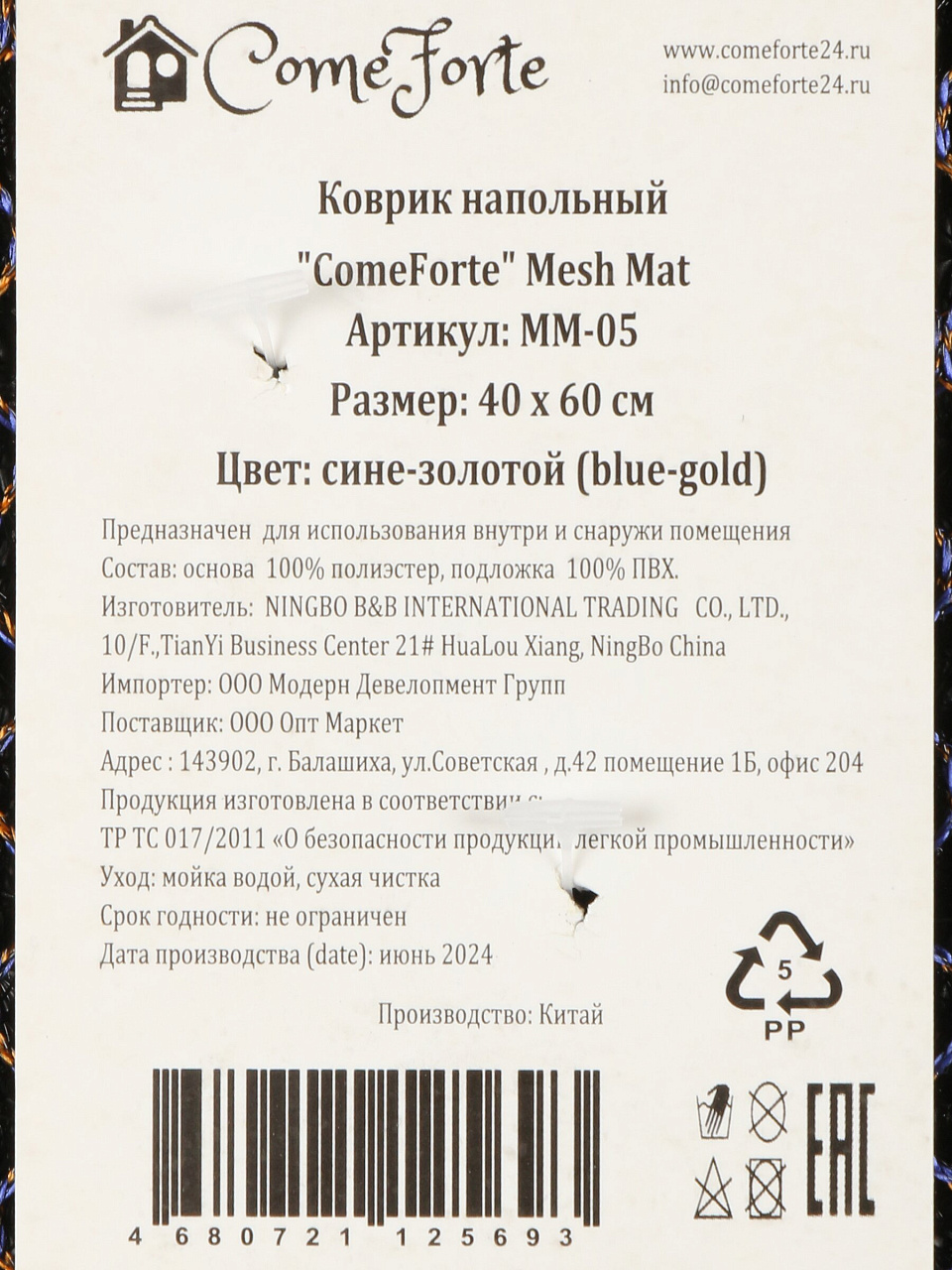 Вы можете приобрести «Коврик грязезащитный, 40х60х0.7 см, прямоугольный, сине-золотой, Mesh mat Комфорт, ComeForte, MM-05» и другие товары в нашем интернет-магазине в Смоленске по низким ценам и с бесплатным самовывозом.