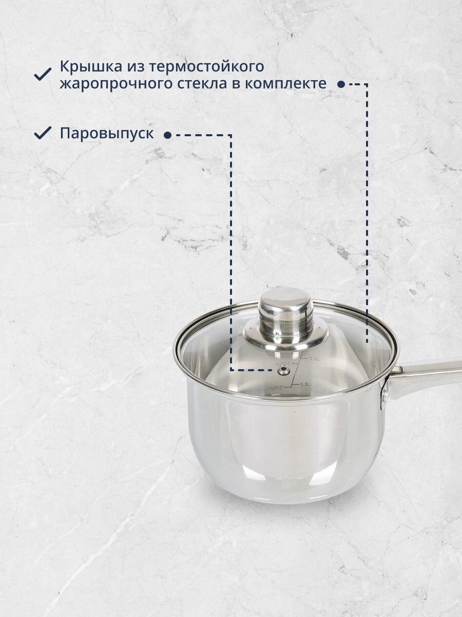 Ковшик посуды DNN3 SD-A17-16S выполнен из высококачественной нержавеющей стали. Крышка из прозрачного стекла позволяет контролировать процесс приготовления пищи. Металлическая ручка удобна, прочна и не нагревается при использовании посуды.