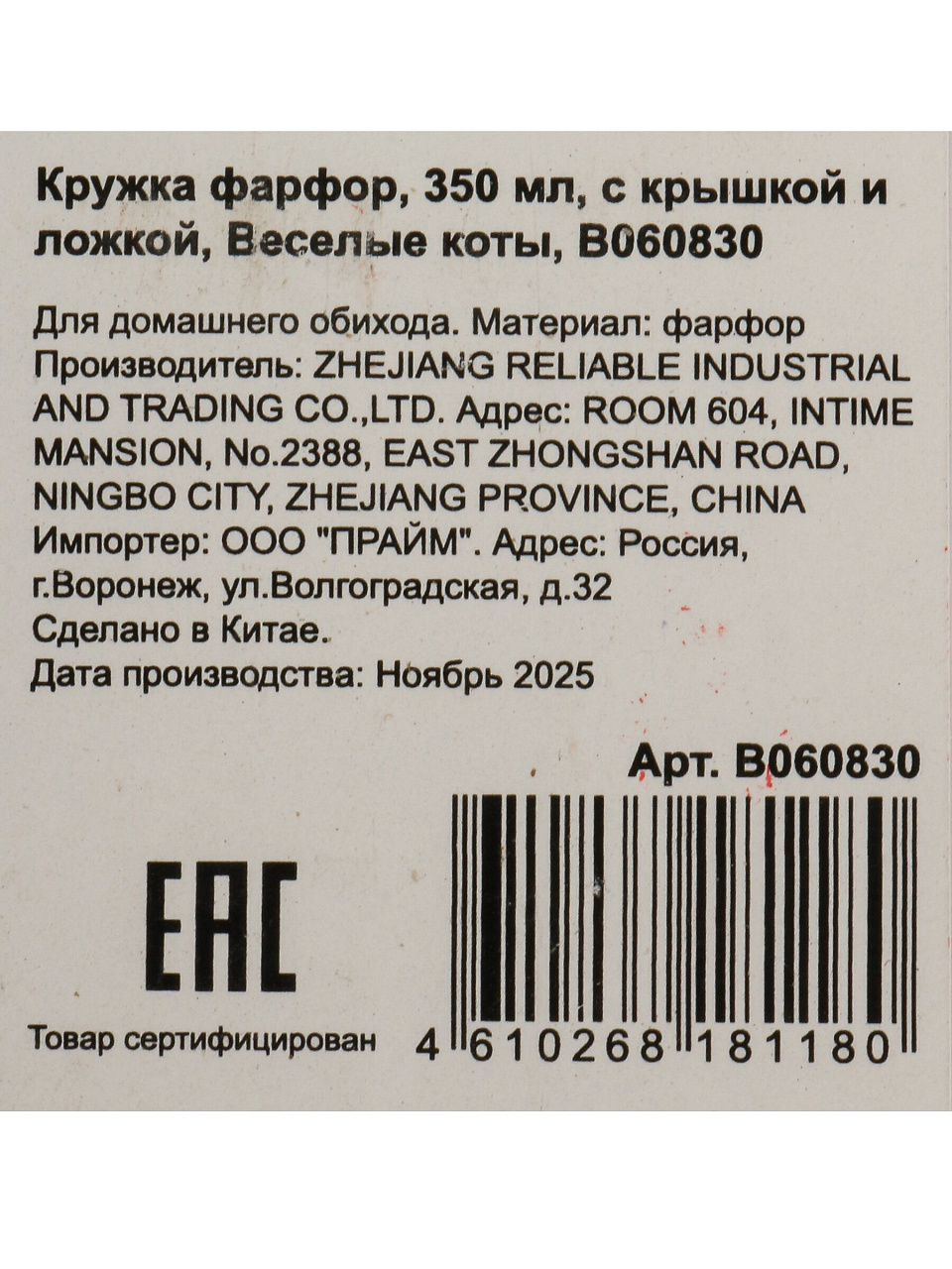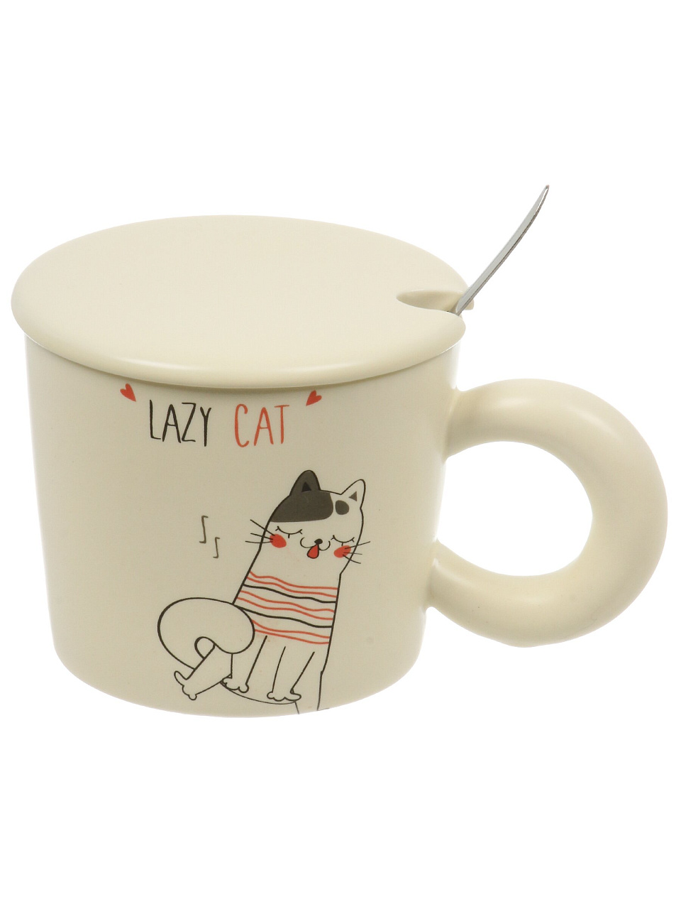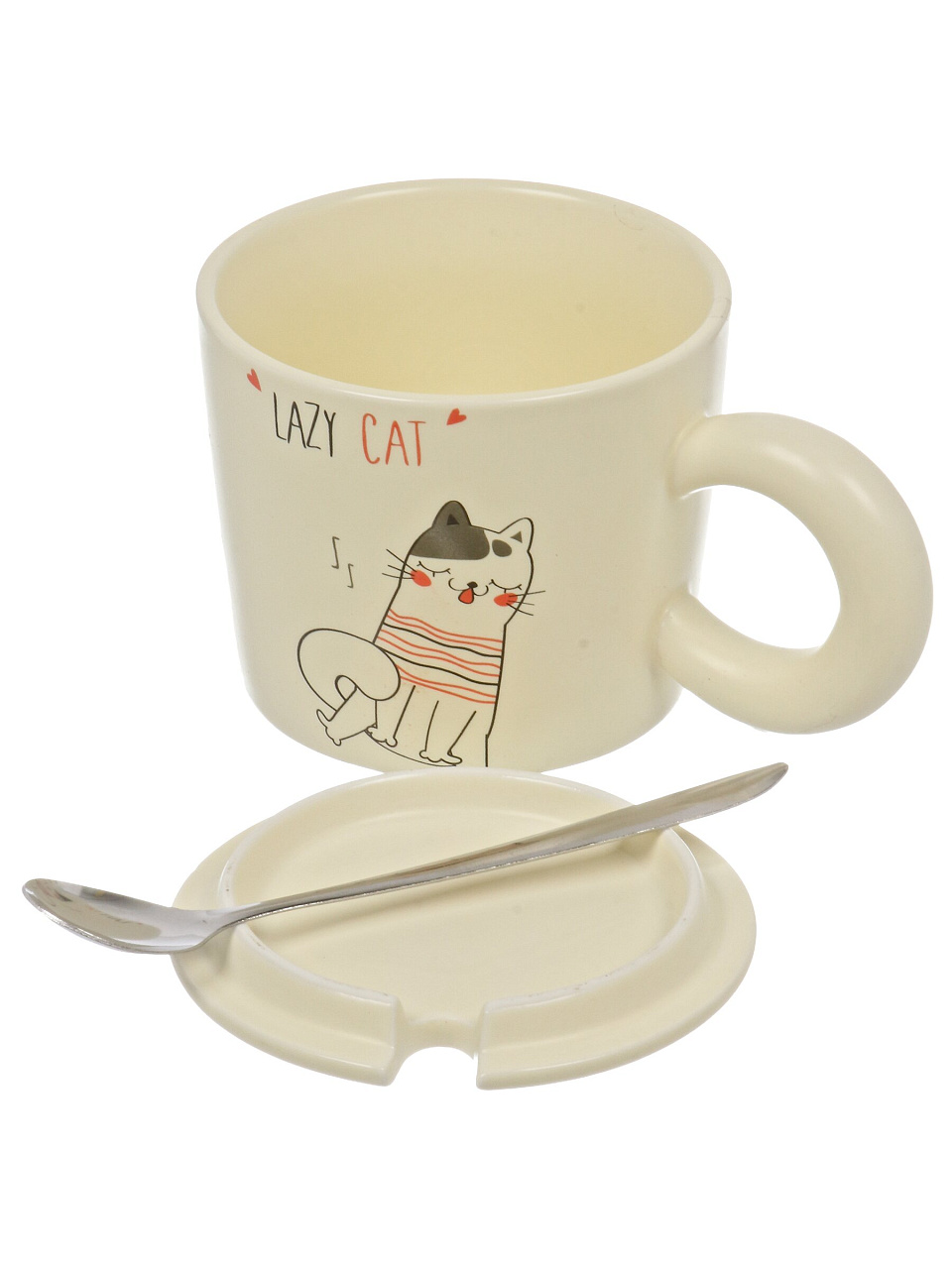 Кружка фарфор, 380 мл, Веселые коты, с крышкой, с ложкой, B060830