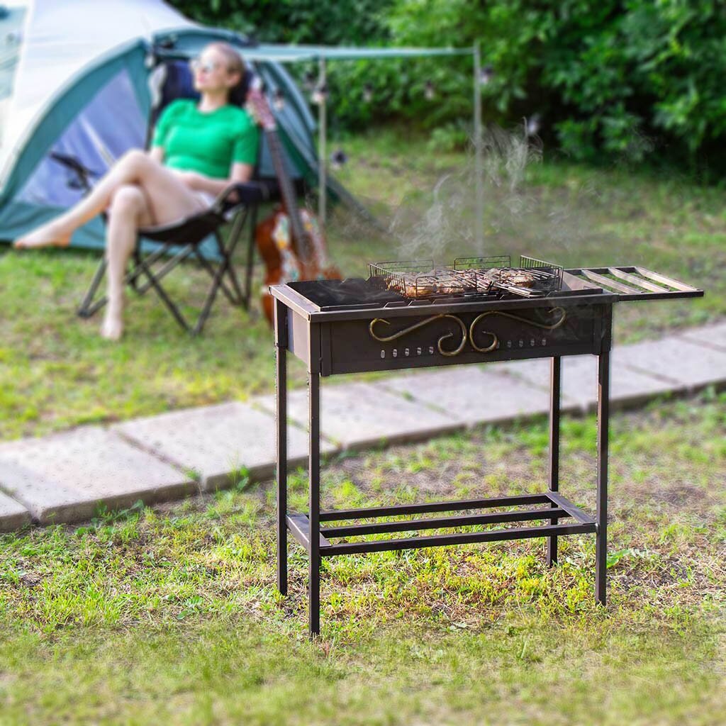 Мангал "Крепыш" предназначен для приготовления пищи на открытом воздухе. Для переноски предусмотрены ручки. Полочка служит для хранения необходимых при готовке принадлежностей. Высота мангала обеспечивает удобство использования.
