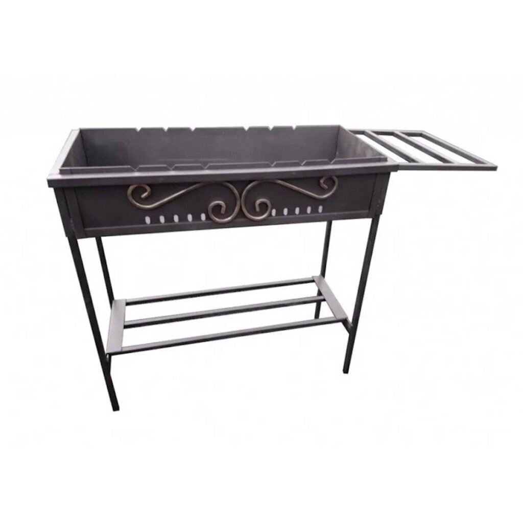 Чаша изготовлена из стали толщиной 2 мм. Мангал украшен декоративными элементами и комплектуется съемной приставкой для посуды и полкой для дров. Шампуры в комплектацию не входят. Термостойкое покрытие, выдерживающее температуру до 700°C, надолго сохранит внешний вид изделия.