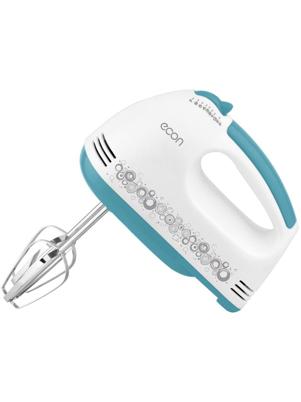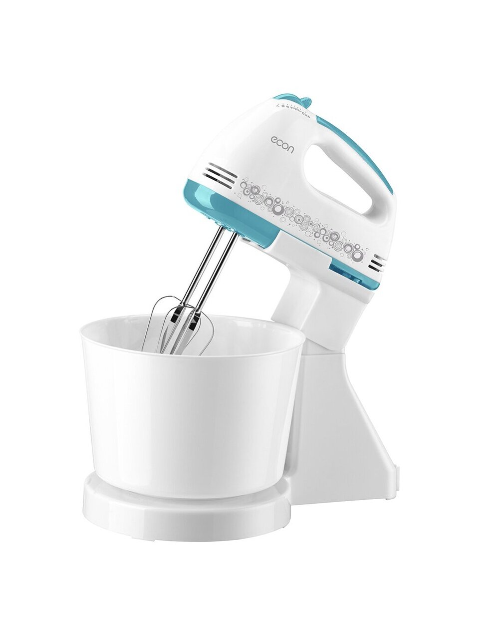 Ручной миксер Econ ECO-201MX с чашей и механической регулировкой скорости вращения насадок.