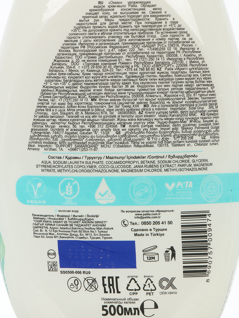 Крем-мыло жидкое Palila Океан — идеальный выбор для ежедневного ухода: интенсивное увлажнение, свежий морской аромат, экономичная упаковка 500 мл.