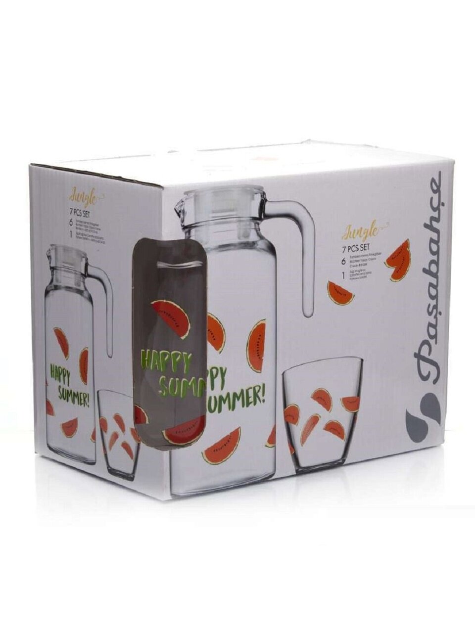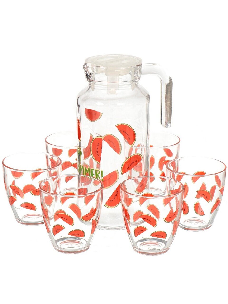 Питьевой набор Pasabahce состоит из 6 стаканов и кувшина. Изделия выполнены из высококачественного прочного стекла и декорированы рисунком в виде арбузных долек. Набор прекрасно подходит для сока, воды, лимонада и других напитков. Графин снабжен пластиковой, плотно закрывающейся крышкой. Изделия сочетают в себе элегантный дизайн и функциональность. Изделия устойчивы к повреждениям и истиранию, в процессе эксплуатации не впитывают запахи и сохраняют первоначальные краски. Такой набор также станет хорошим подарком к любому случаю.