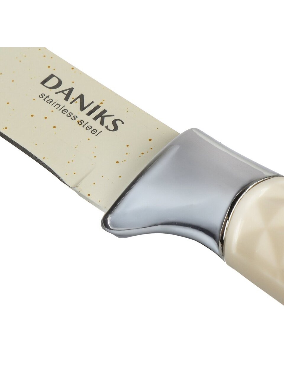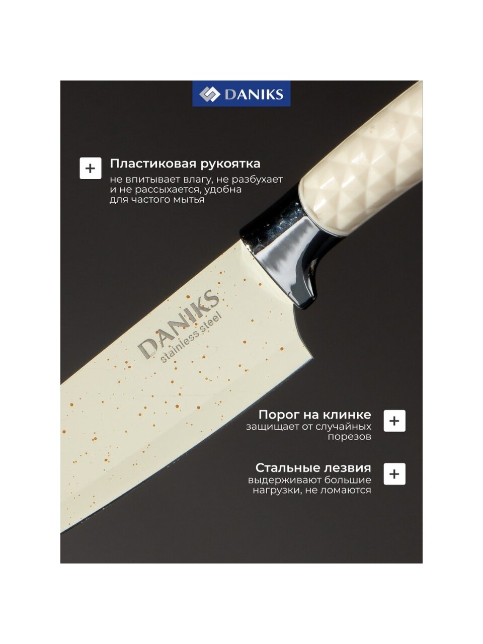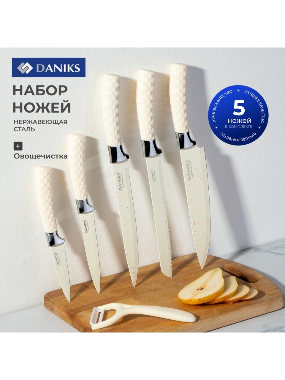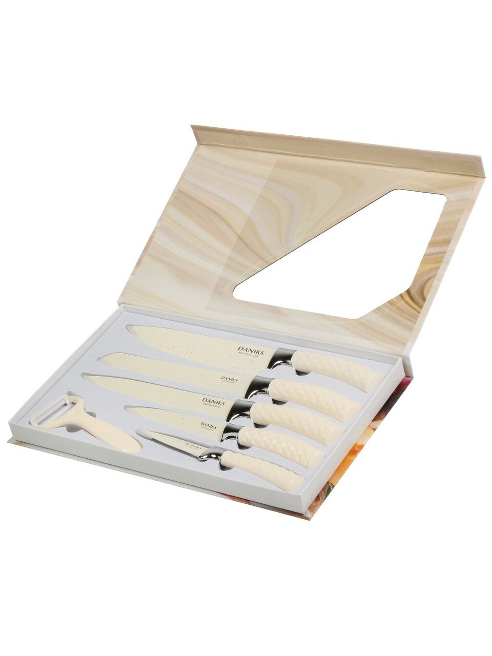 Стильный набор ножей Daniks YW-A454-PB — идеальное решение для современной кухни и отличный подарок для ценителей функциональности и эстетики. Белый цвет и элегантная подарочная упаковка делают комплект привлекательным для любого интерьера, а прочные материалы гарантируют долгий срок службы. Набор включает пять ножей и овощечистку, что обеспечивает универсальность использования: от нарезки хлеба до чистки овощей. Эргономичные пластиковые рукоятки обеспечивают удобство и безопасность при работе, а лезвия из нержавеющей стали сохраняют остроту даже при интенсивном использовании.
