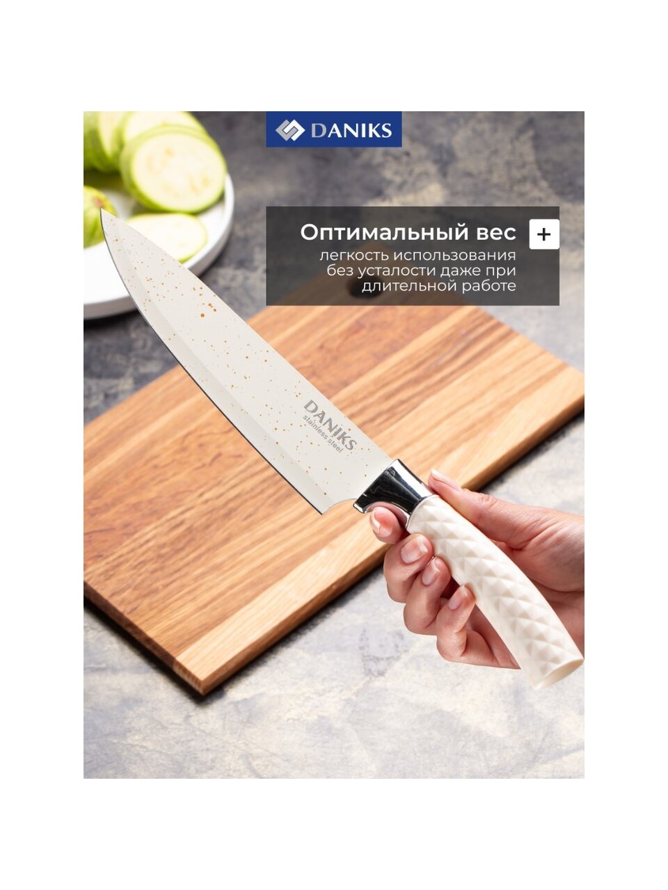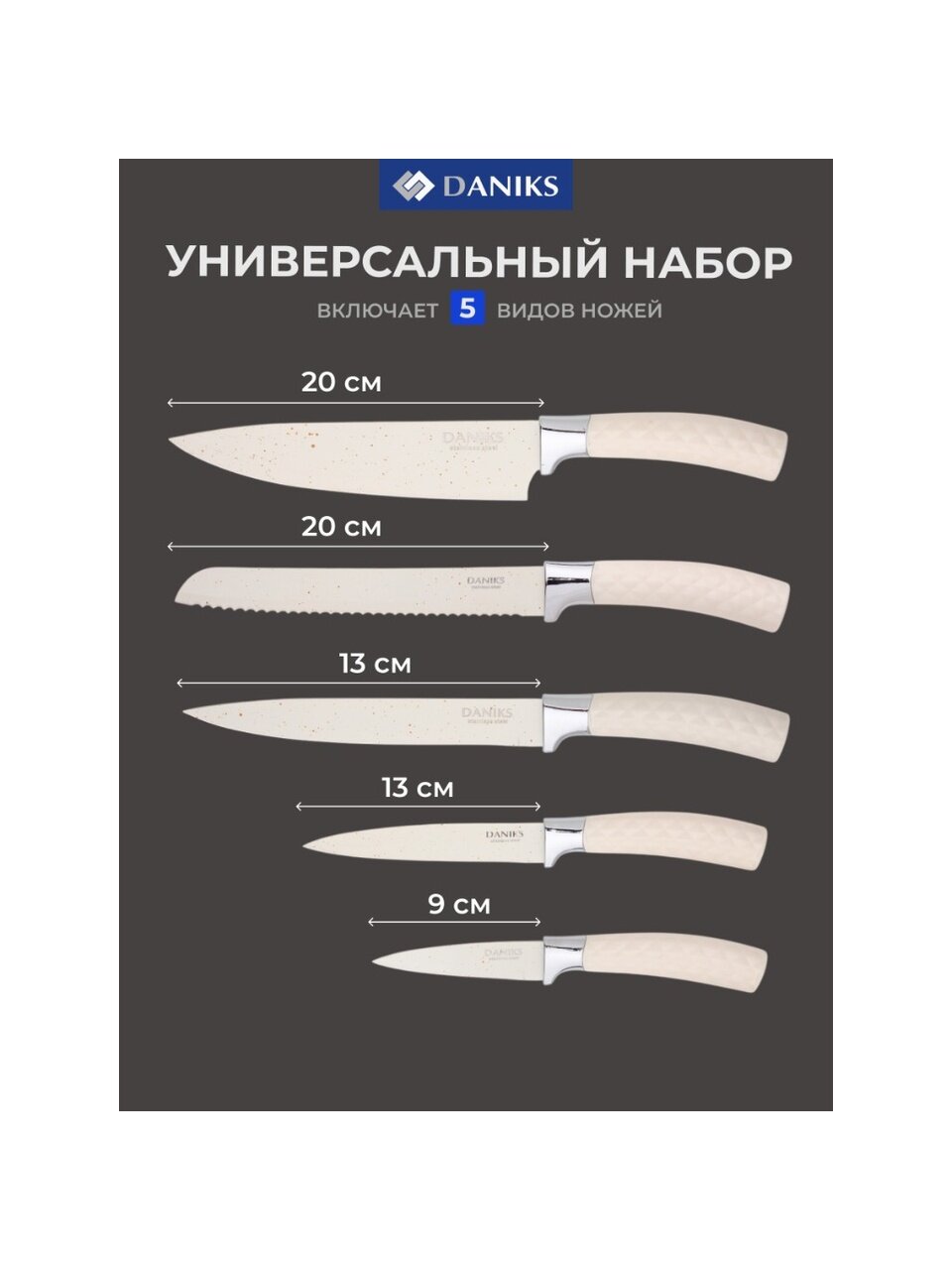- универсальность: комплект включает шеф-нож, нож для овощей, универсальный нож, хлебный нож, разделочный нож и овощечистку;