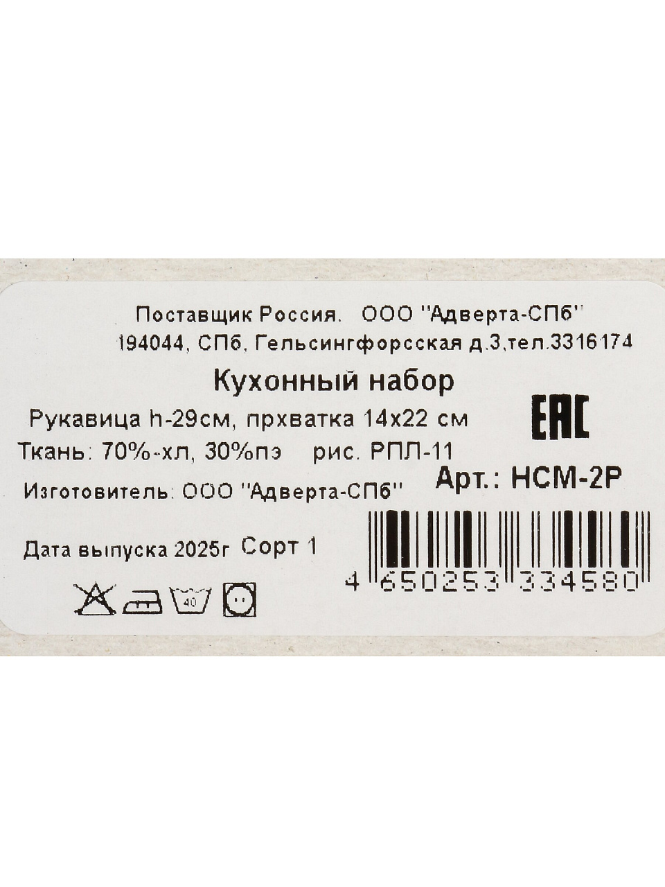 - Оптимальные размеры: варежка 29 см, прихватка 22х14 см; состав — 70% хлопок, 30% полиэстер — долговечность и комфорт в использовании.