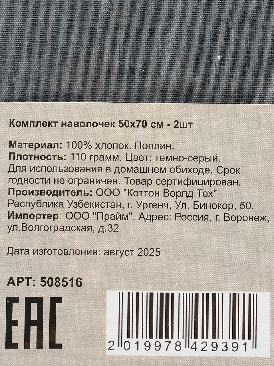 Размер каждой наволочки — 50х70 см, подходит для большинства стандартных подушек. Материал — 100% хлопок поплин, плотность 110 г/м².