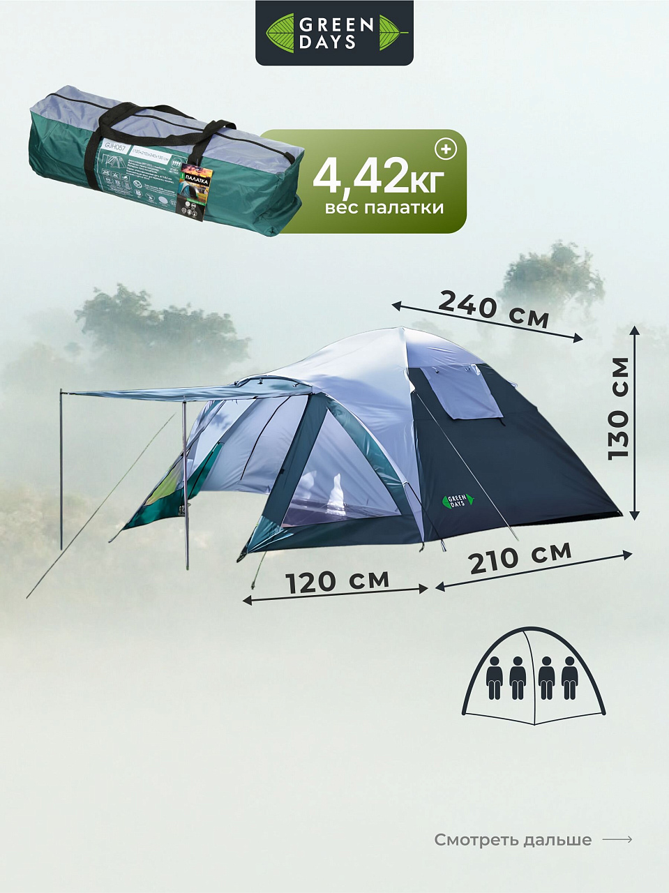 Вы можете приобрести «Палатка 4-местная, 210+120х240х130 см, 2 слоя, 1 комн, 1 тамб, с москитной сеткой, 2 вентиляционных окна, Green Days, GJH057» и другие товары в нашем интернет-магазине в Ельце по низким ценам и с бесплатным самовывозом.