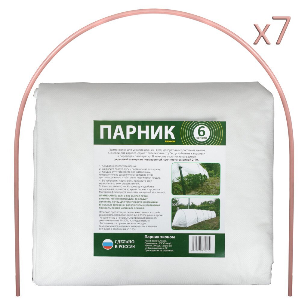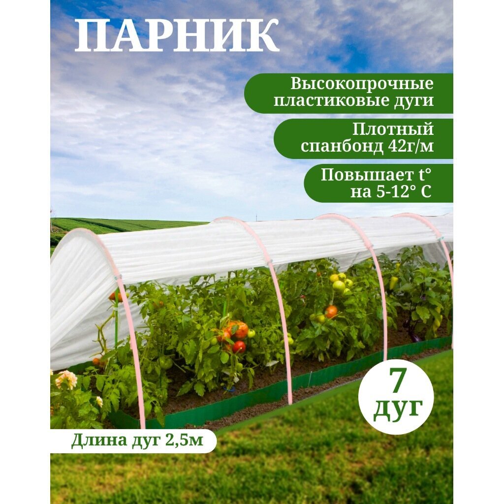 Парник обладает шириной 1 метр, длиной 6 метров и высотой 0.7 метра, что делает его достаточно просторным для размещения большого количества растений. Материал покрытия — спанбонд с плотностью 42 г/м2 — обеспечивает хорошую вентиляцию и защиту от ультрафиолетовых лучей, поддерживая необходимый уровень влажности и температуры внутри парника. Каркас из пластика с дугами длиной 2.5 метра и диаметром трубы 16 мм гарантирует прочность и устойчивость конструкции.