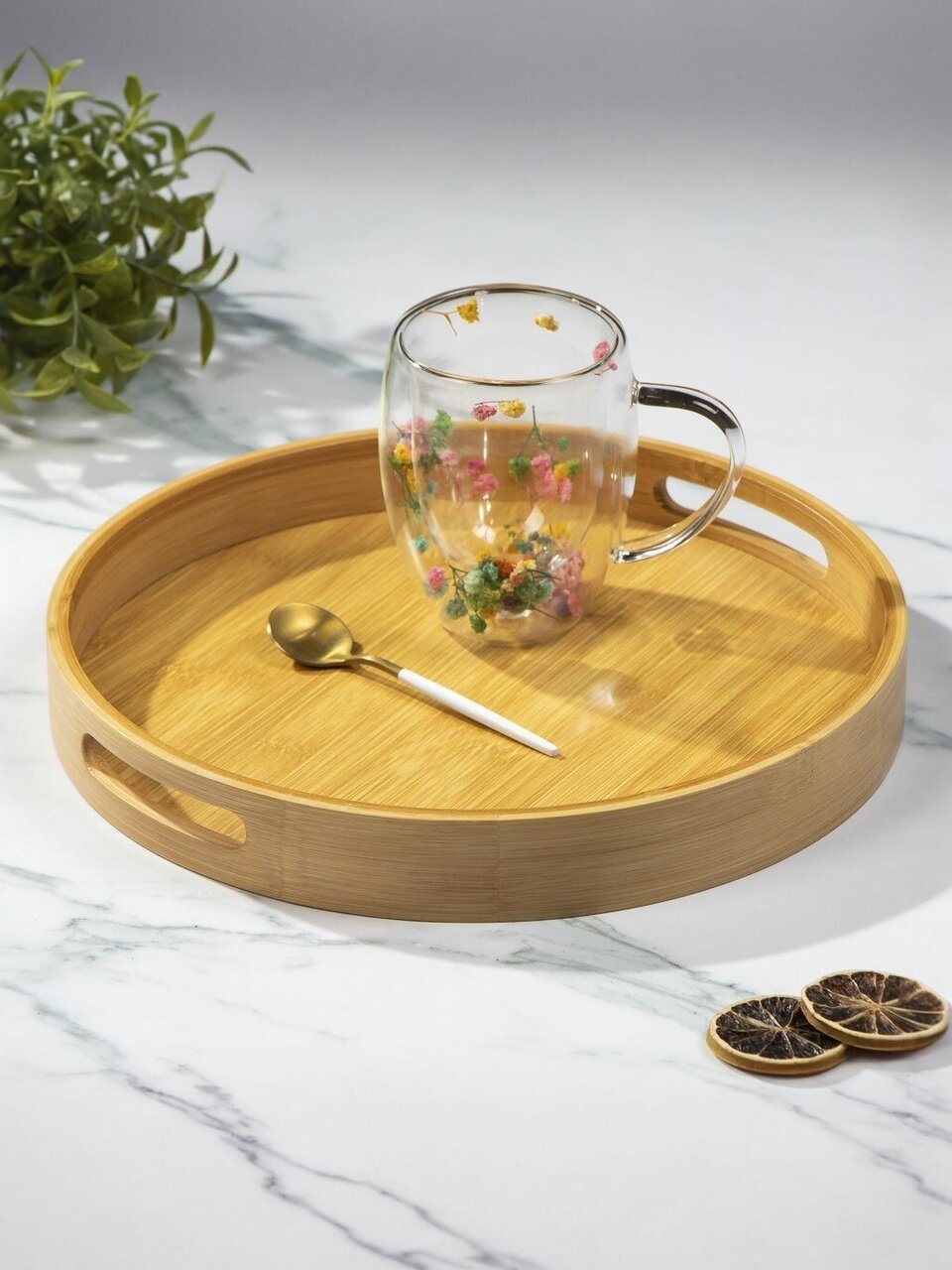 Откройте для себя стиль и функциональность с бамбуковым подносом диаметром 30 см. Этот круглый поднос с ручками, модель Y4-8887, станет незаменимым помощником в вашем доме. Идеальный выбор для сервировки чая или кофе, он также прекрасно подойдет для универсального использования, добавляя нотку элегантности в повседневные моменты.