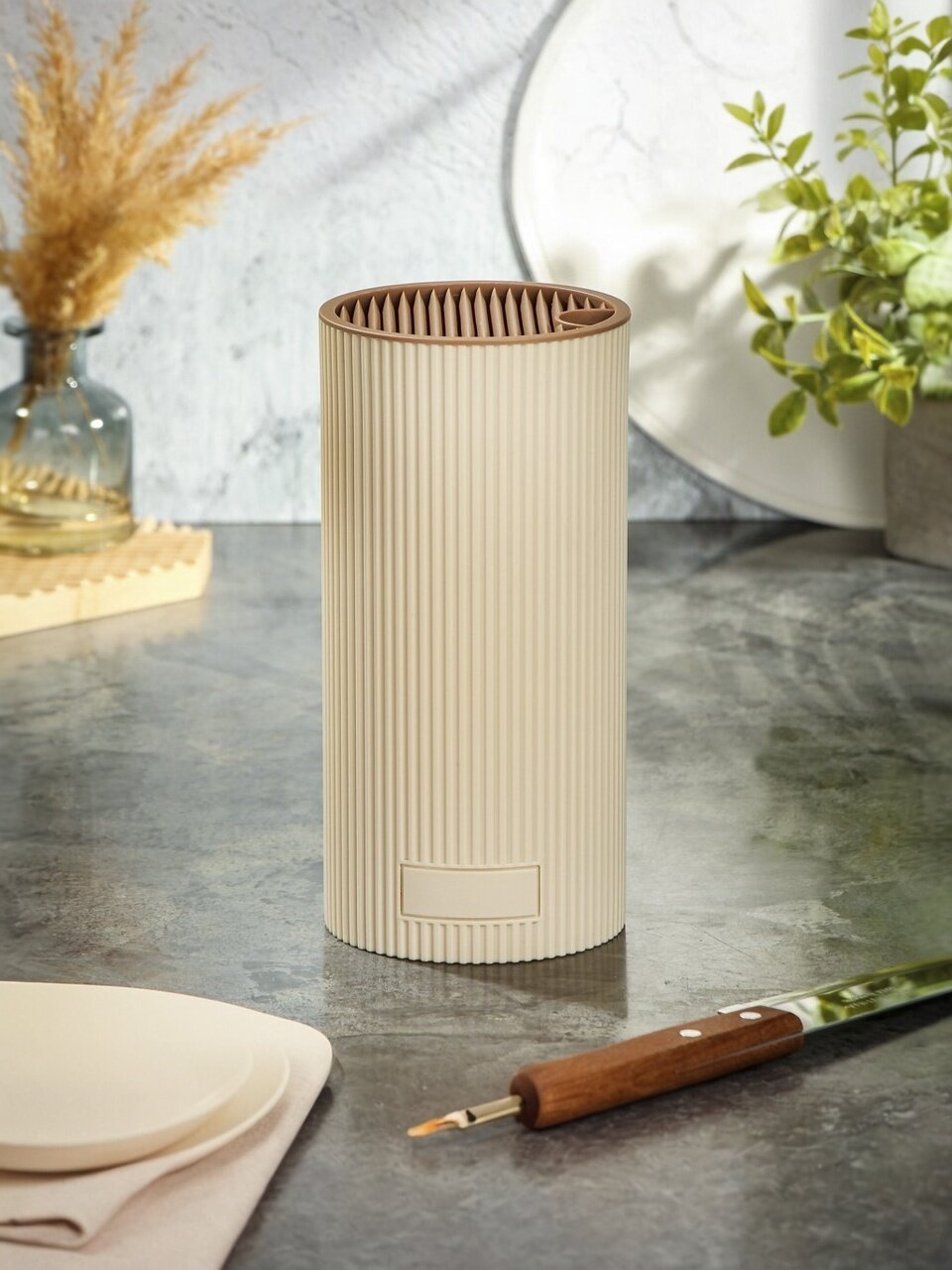 Откройте для себя идеальное решение для хранения ножей на кухне! Подставка для ножей из пластика высотой 22 см, модель Y4-8716, станет незаменимым помощником в организации пространства на кухне. Элегантный бежевый оттенок и цилиндрическая форма этой подставки гармонично впишутся в любой интерьер, добавляя нотку современности и стиля.