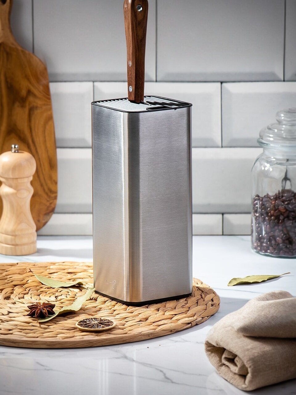 Органайзер для ножей позволит хранить каждый нож отдельно друг от друга. Так не будут тупиться лезвия, портиться рукоятки, а риск порезов сводится к нулю. Данная подставка для кухонных ножей является функциональной и практичной. Помимо того, что это стильный органайзер для ваших ножей, это еще и эффектный предмет интерьера со съемным верхом для удобства при мытье. Поверхность подставки для столовых ножей немаркая.