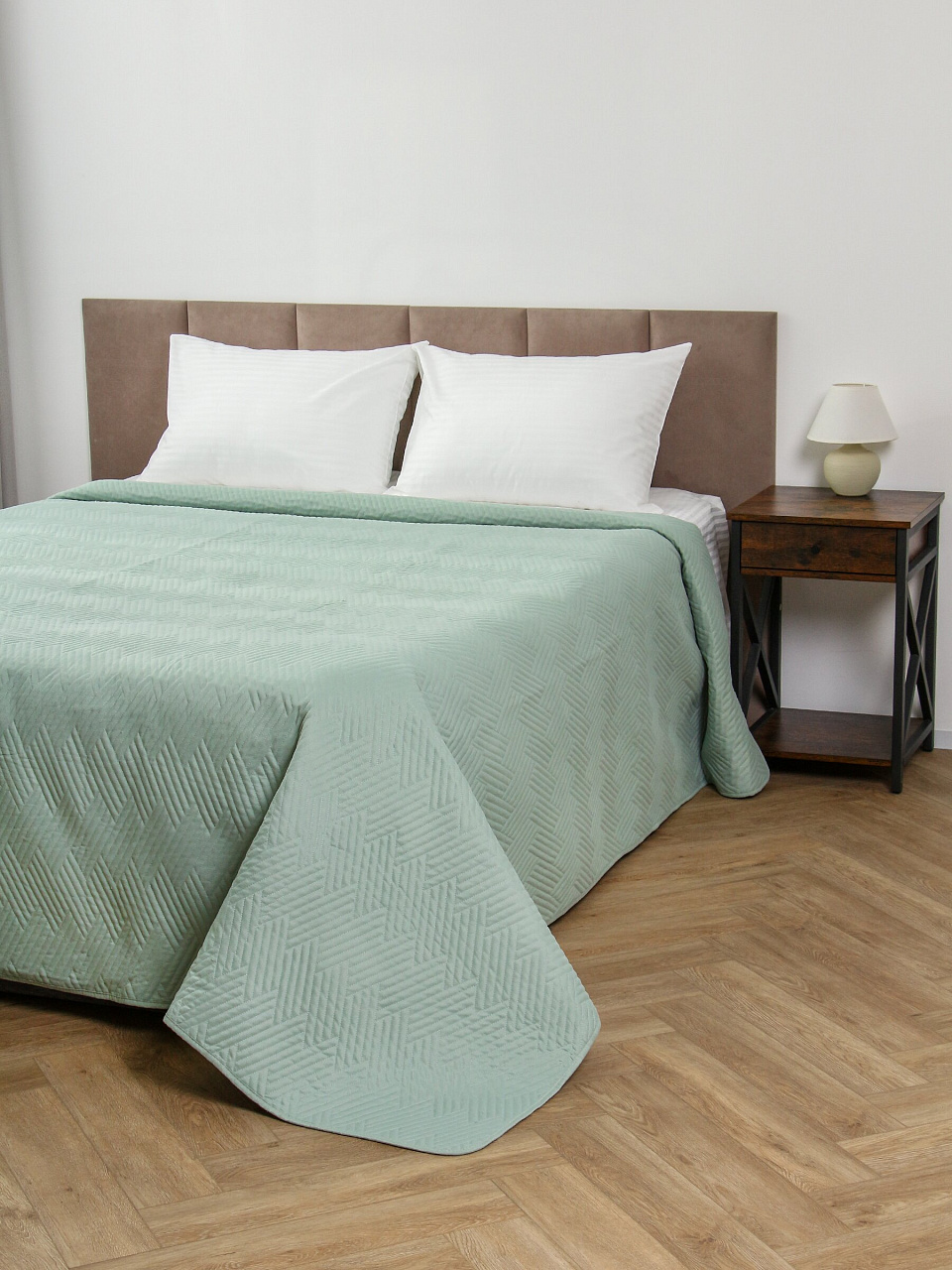 Покрывало выполнено из 100% полиэстера, стеганое, однотонное, не двустороннее, размер 240х260 см, цвет серо-мятный, стиль — минимализм.