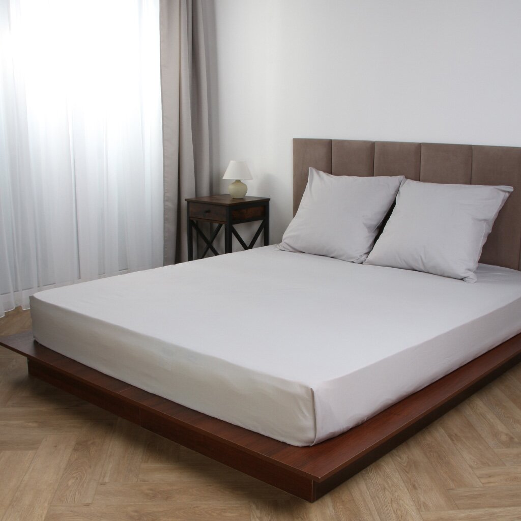 Для стандартной полуторной кровати оптимален размер 150×214 см. Эта простыня подходит для большинства матрасов шириной 80–120 см, не сползает и полностью закрывает поверхность.