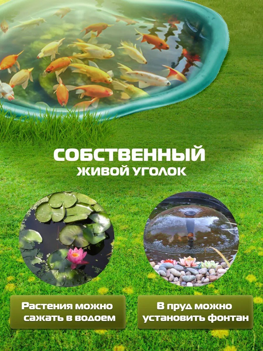 Пруд подходит для водных обитателей, что открывает широкие возможности для создания живого уголка с рыбками, лягушками или водными растениями. Благодаря компактным размерам (длина 140 см, ширина 105 см, глубина 45 см), пруд не требует больших затрат времени и сил на установку, а уход за ним будет минимальным. Зеленый цвет внутренней поверхности подчеркивает чистоту воды и создает естественный фон для водных обитателей.
