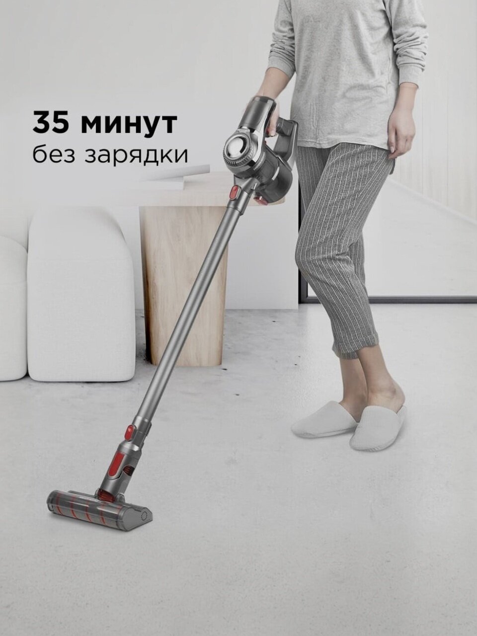 - Зарядка аккумулятора вертикального беспроводного пылесоса REDMOND RV-UR363 занимает всего 4 часа, после чего пылесос может работать до 35 минут на минимальной мощности и до 23 минут — на максимальной.