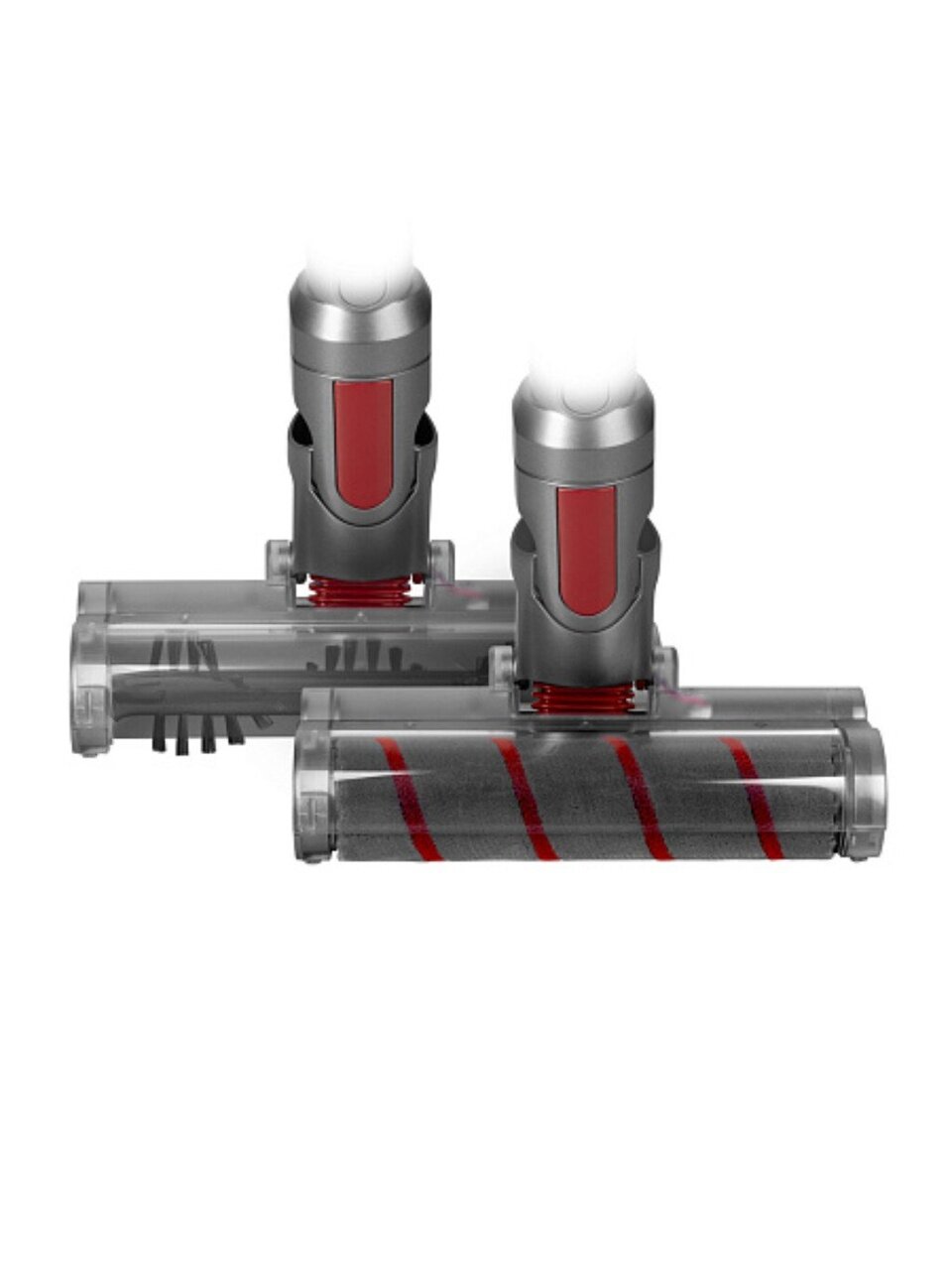 - Турбощетка имеет два сменных валика, обеспечивающих мощное всасывание на различных поверхностях. Универсальная насадка 2 в 1 позволяет собирать шерсть, волосы, пыль и мелкий мусор с мягкой мебели, тканей и автомобильных сидений. С помощью щелевой насадки можно очищать углы, щели и стыки.