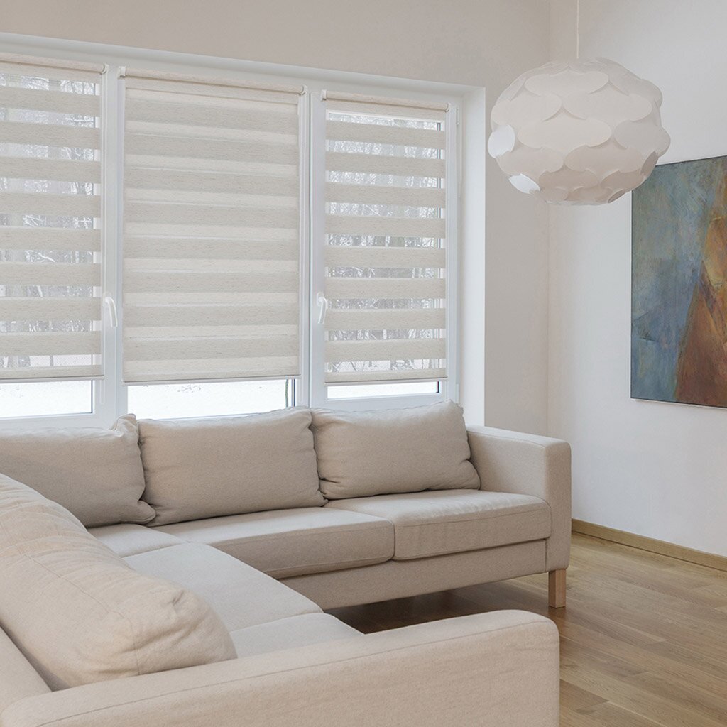 Рулонная штора "День-Ночь" - это отличное решение в оформлении окна. Рулонная штора состоит из ткани, с чередующимися полосами из прозрачного и непрозрачного материала, расположенной в два слоя. Уникальность двойной рулонной шторы заключается в её универсальности. Она имеет и привлекательный внешний вид, и легка в управлении, и, кроме того, даёт возможность контролировать интенсивность солнечного света, непосредственно на самом изделии.