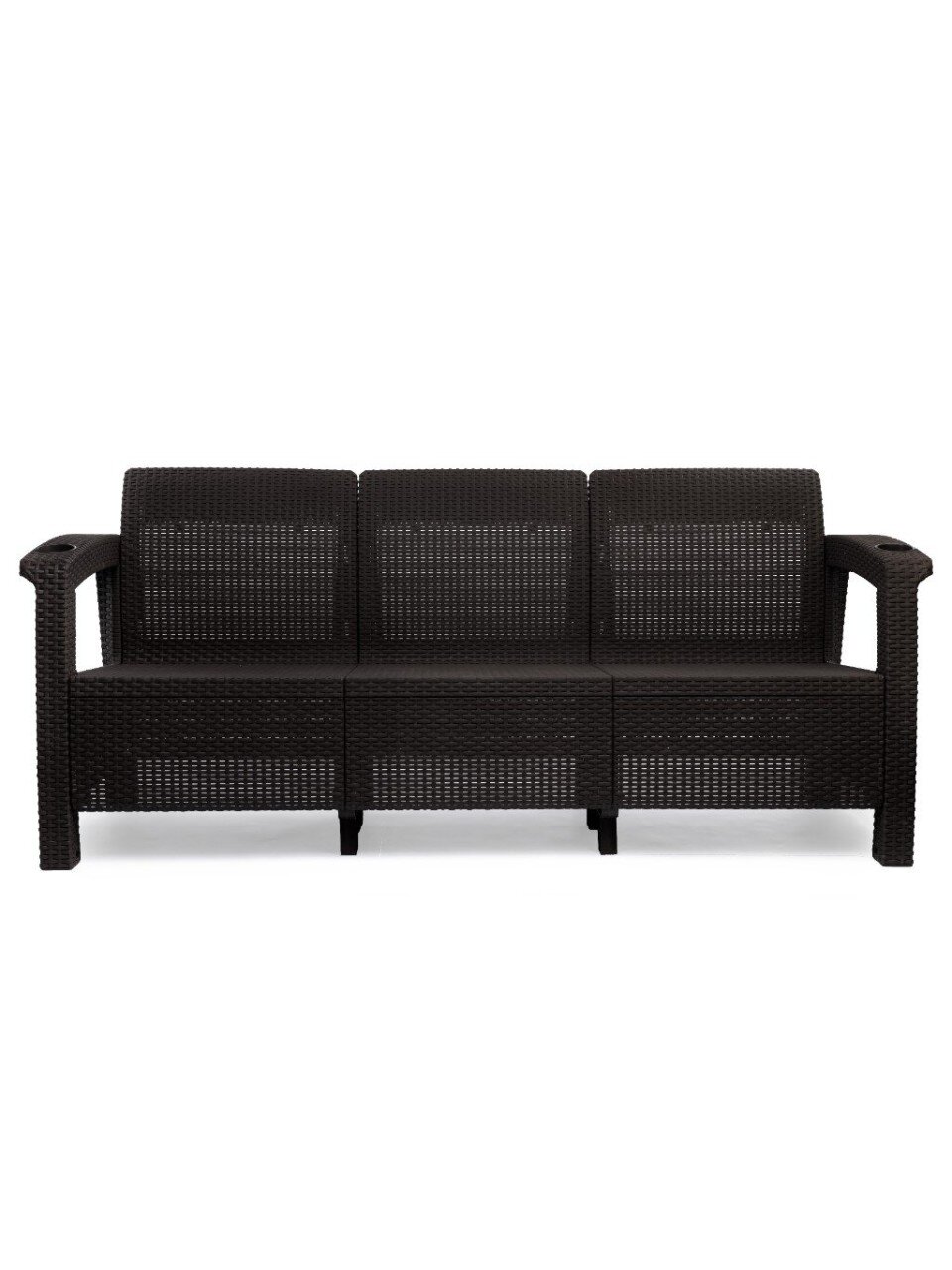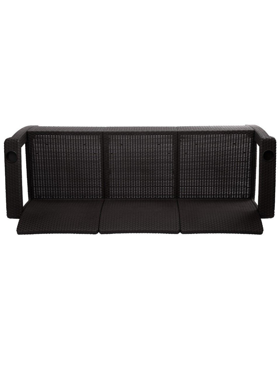 Диван «Ротанг-плюс» изготовлен из всепогодного пластика, устойчив к влаге и ультрафиолету, не деформируется на открытом воздухе и подходит для круглогодичного использования.
