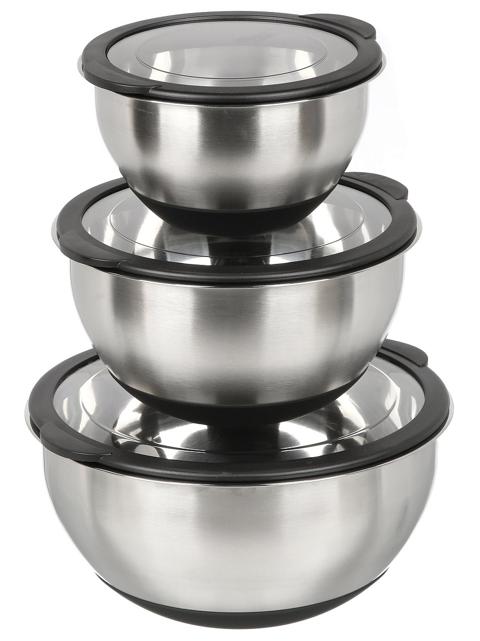 В набор включены три круглые миски диаметром 16, 20 и 24 см, что закрывает практически все базовые потребности в кулинарии — от подготовки малых порций до замешивания больших объемов продуктов.